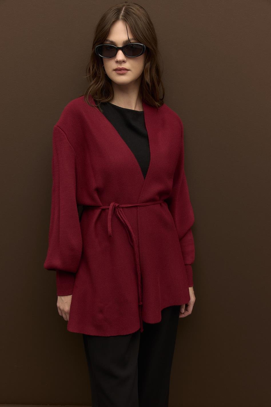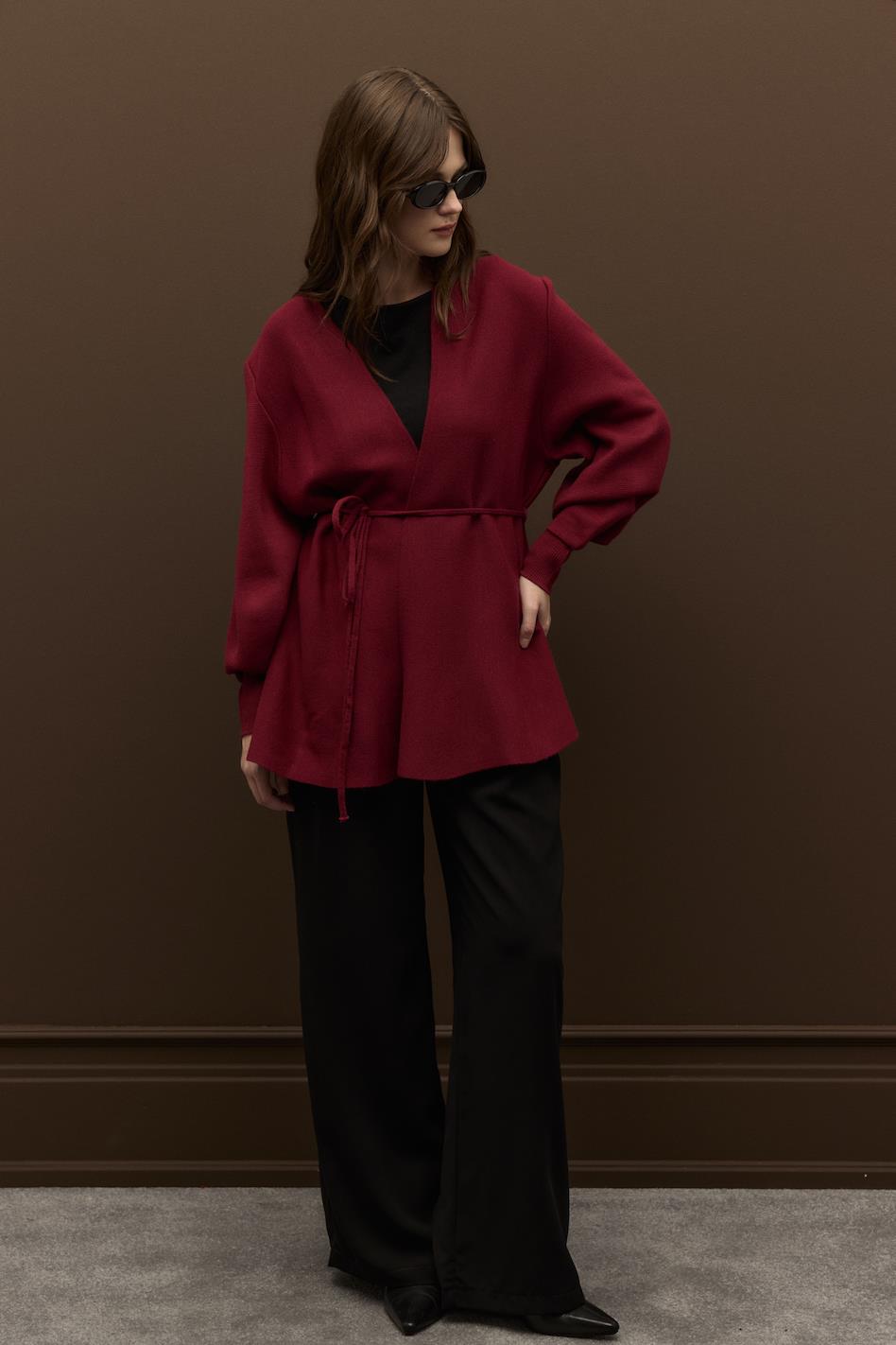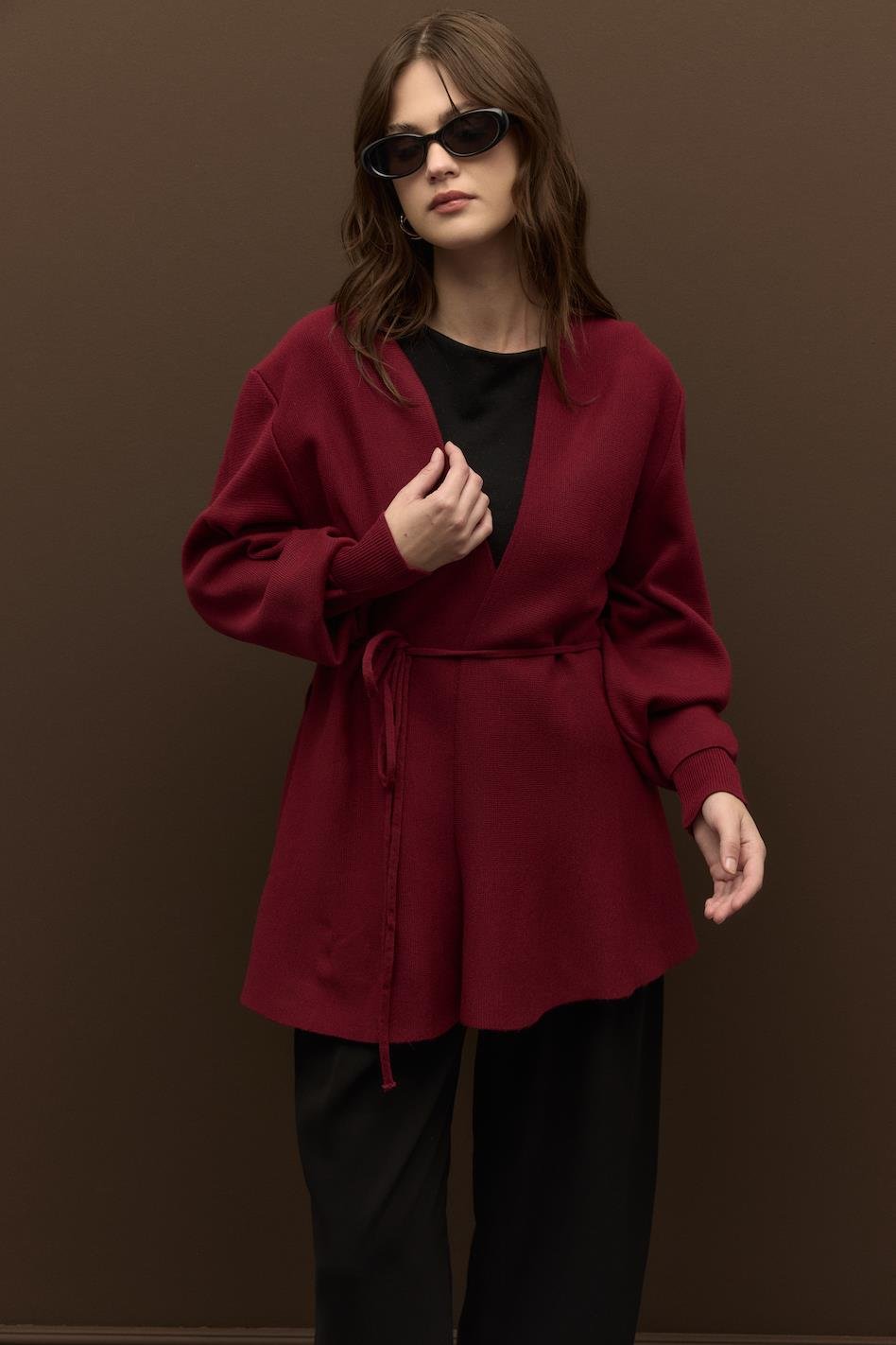 Biye Kemerli Volanlı Çelik Örme Triko Hırka Bordo