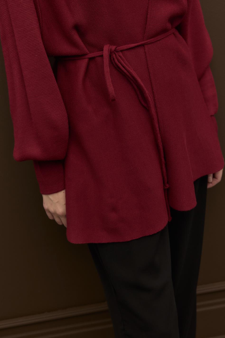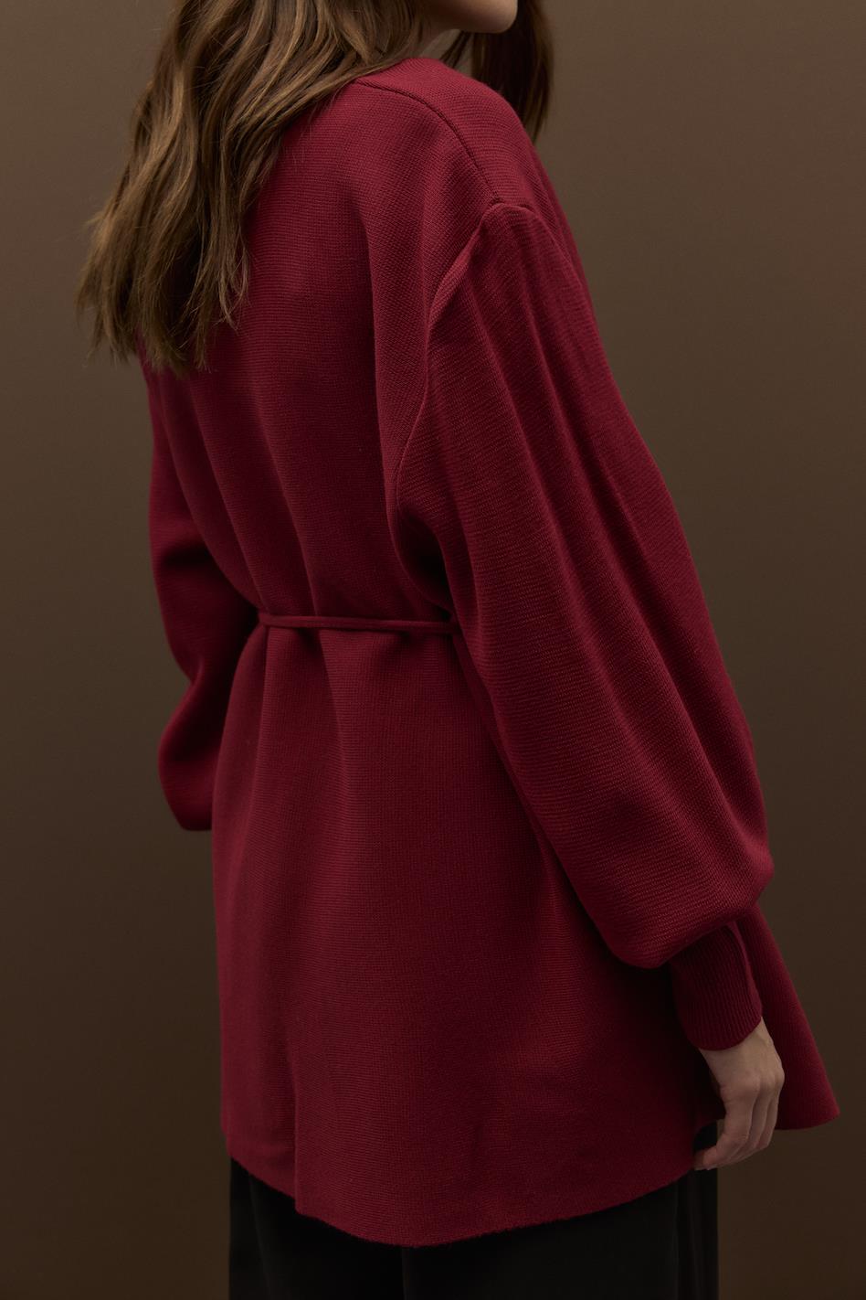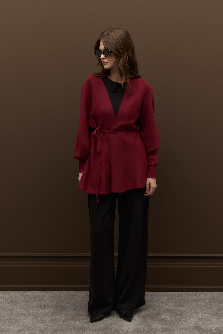 Biye Kemerli Volanlı Çelik Örme Triko Hırka Bordo