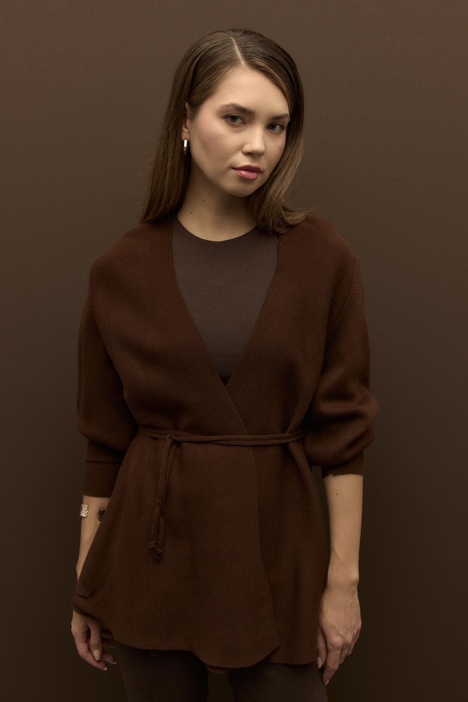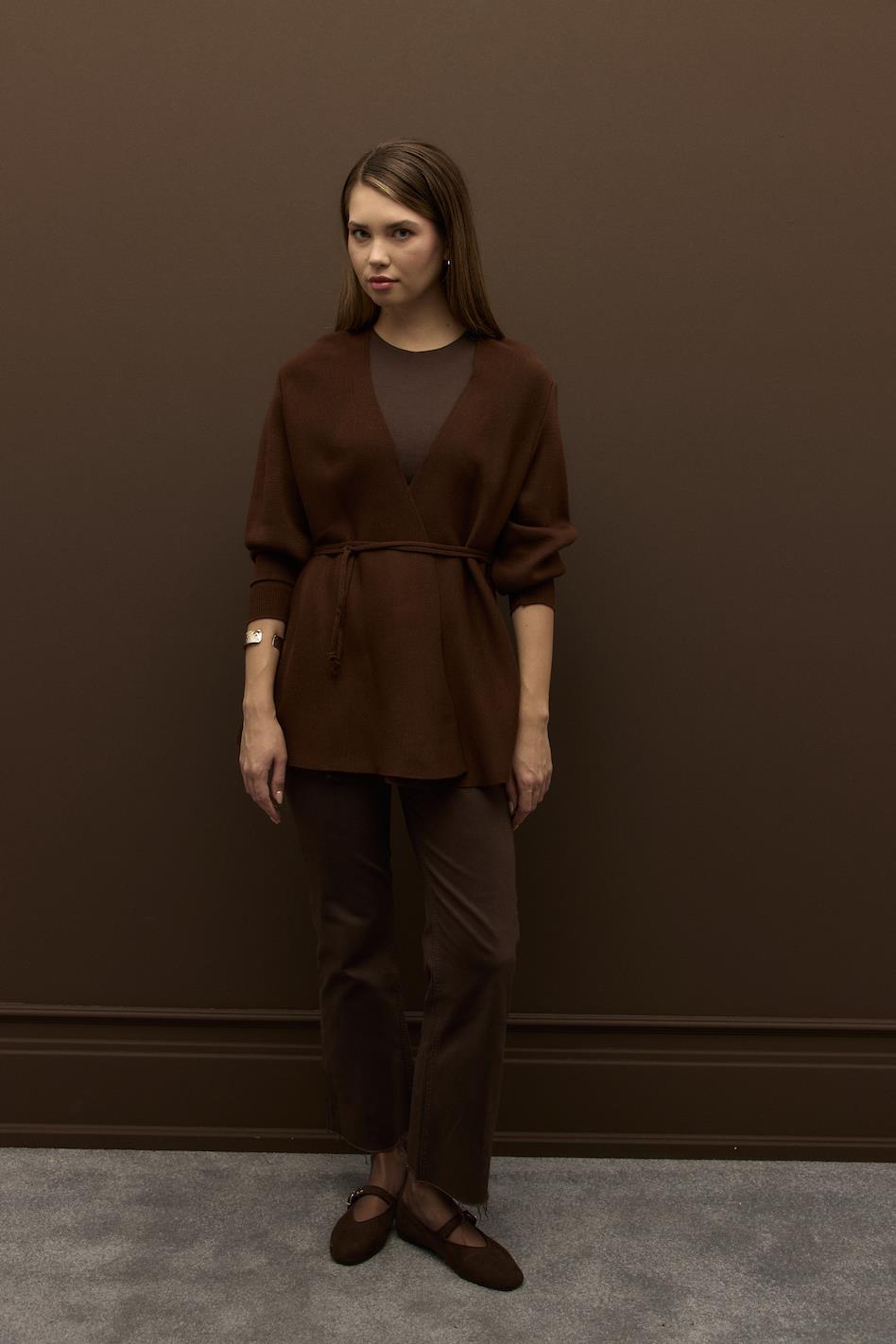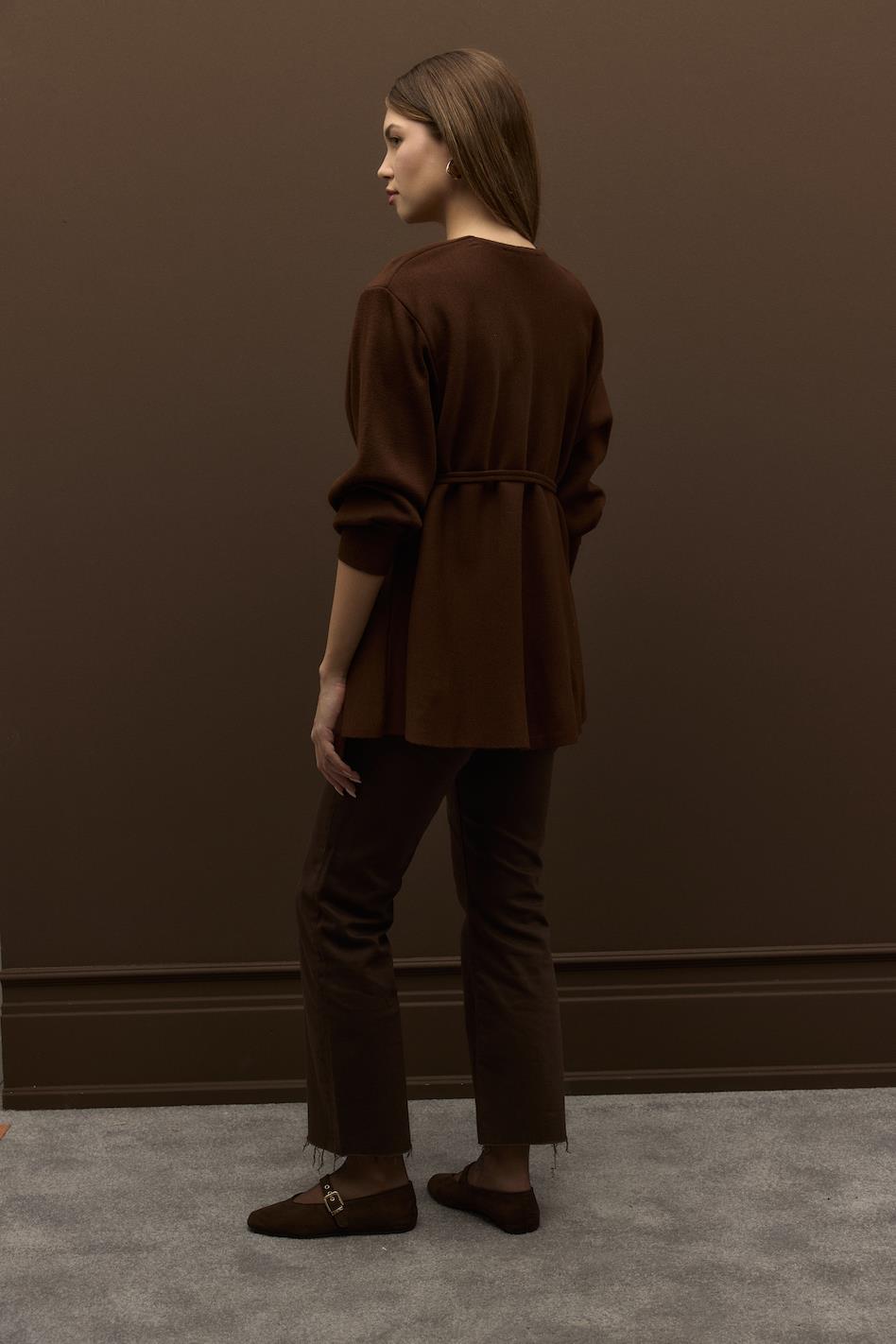 Biye Kemerli Volanlı Çelik Örme Triko Hırka Kahve