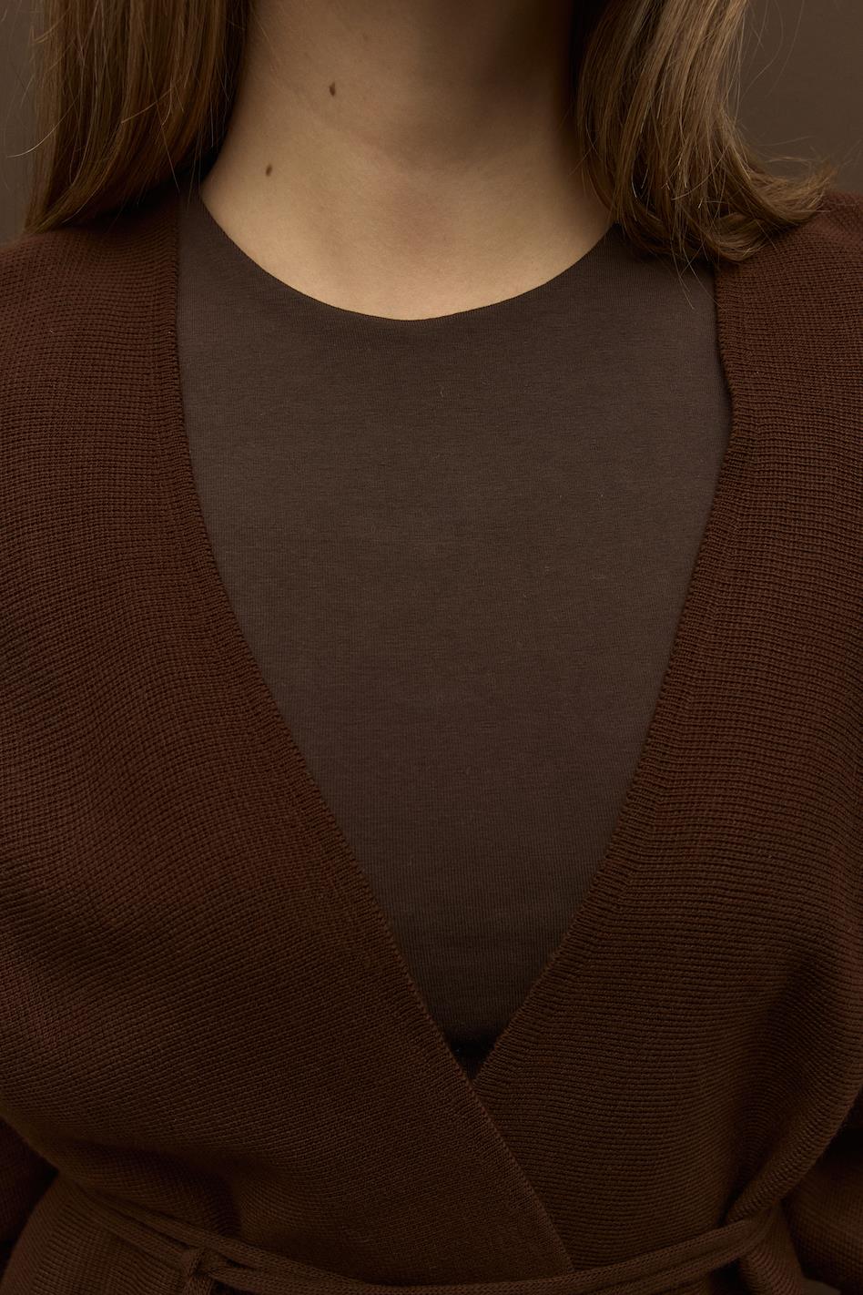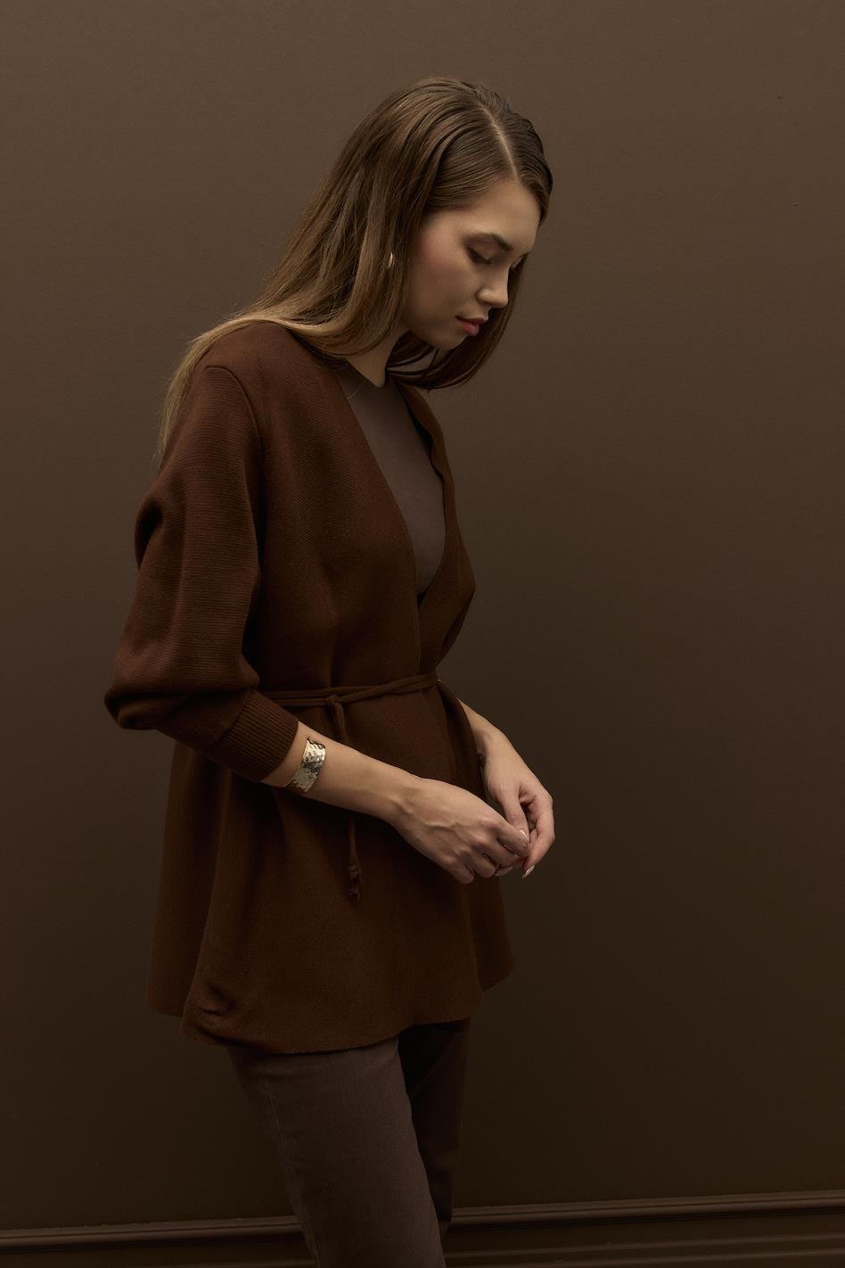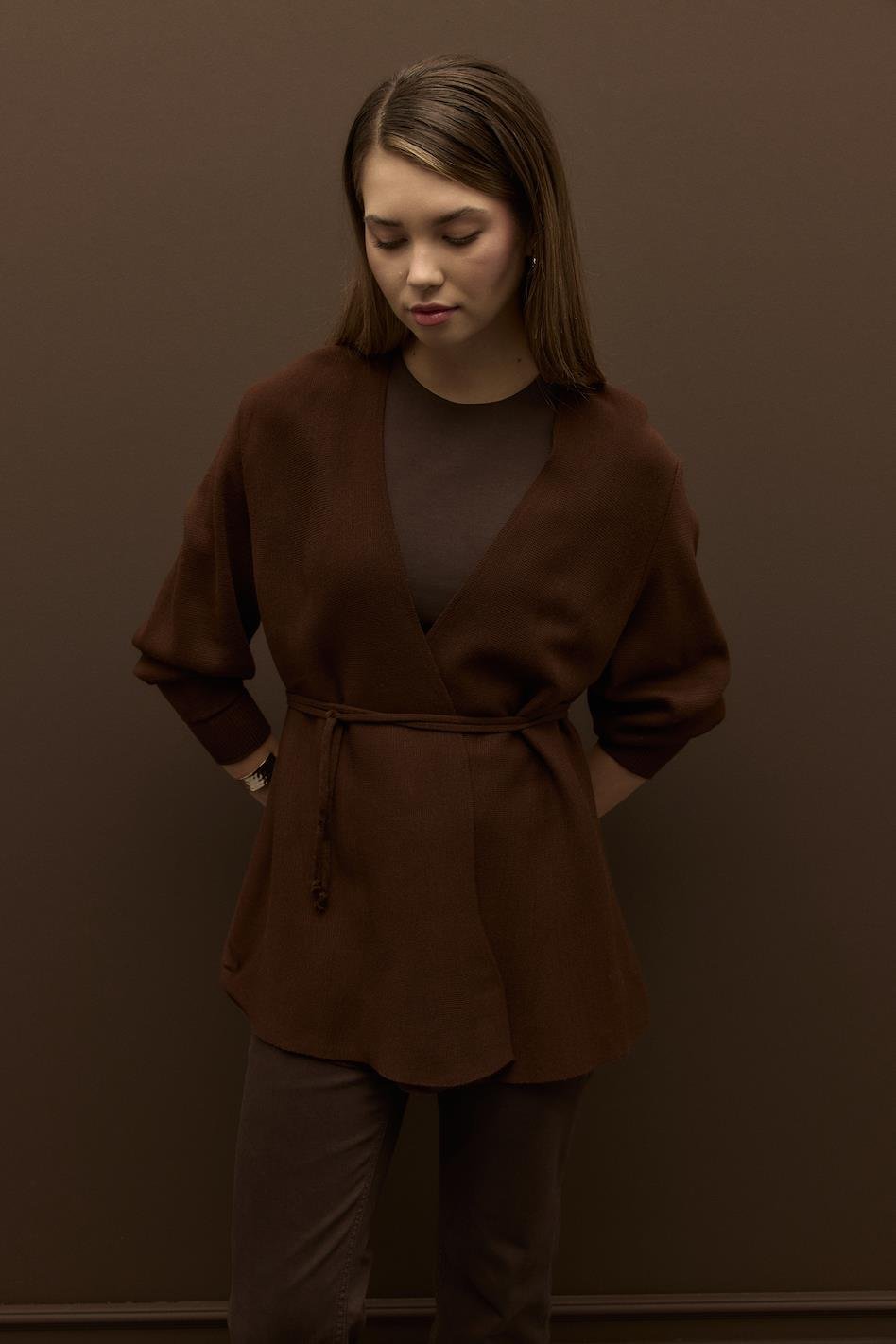 Biye Kemerli Volanlı Çelik Örme Triko Hırka Kahve