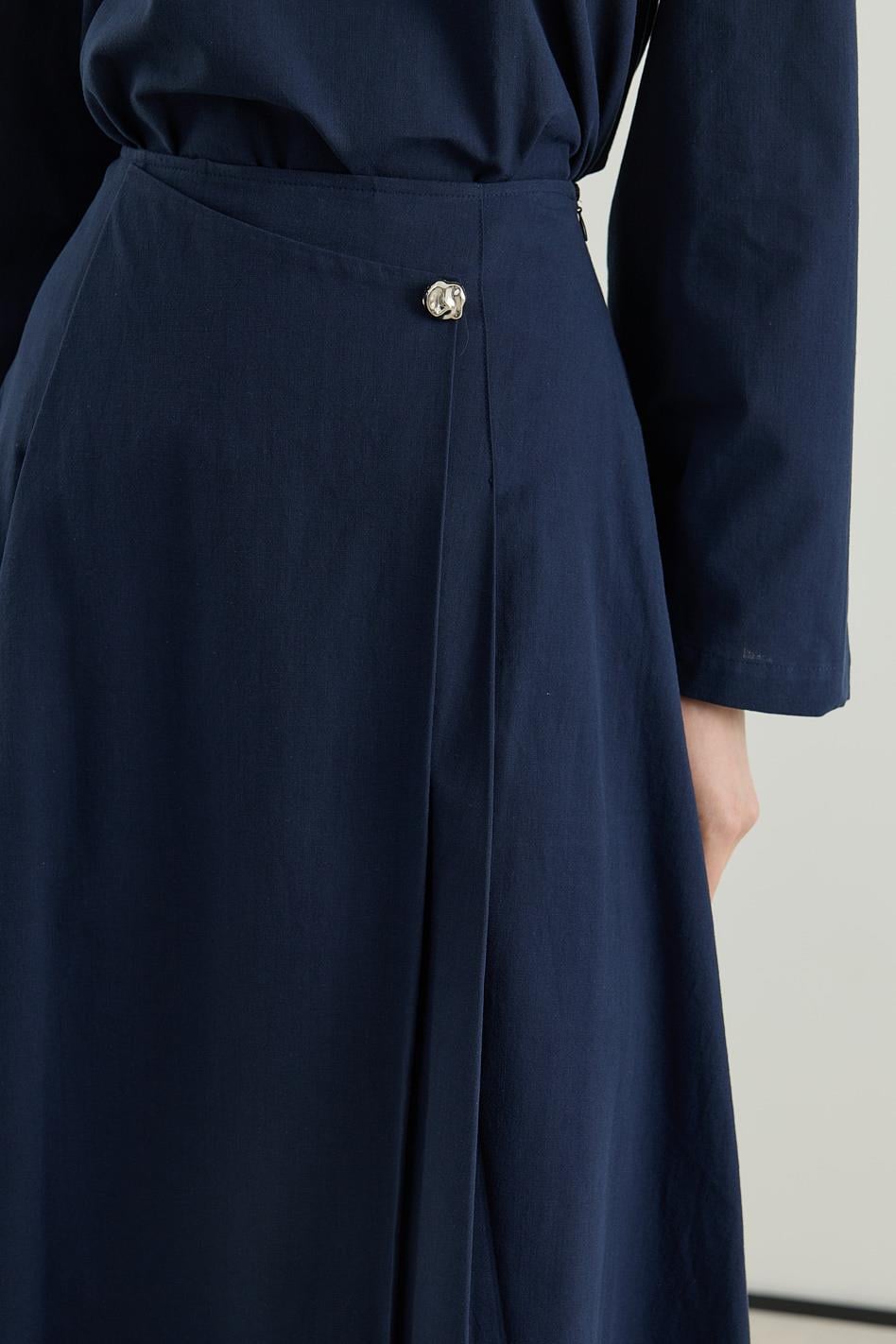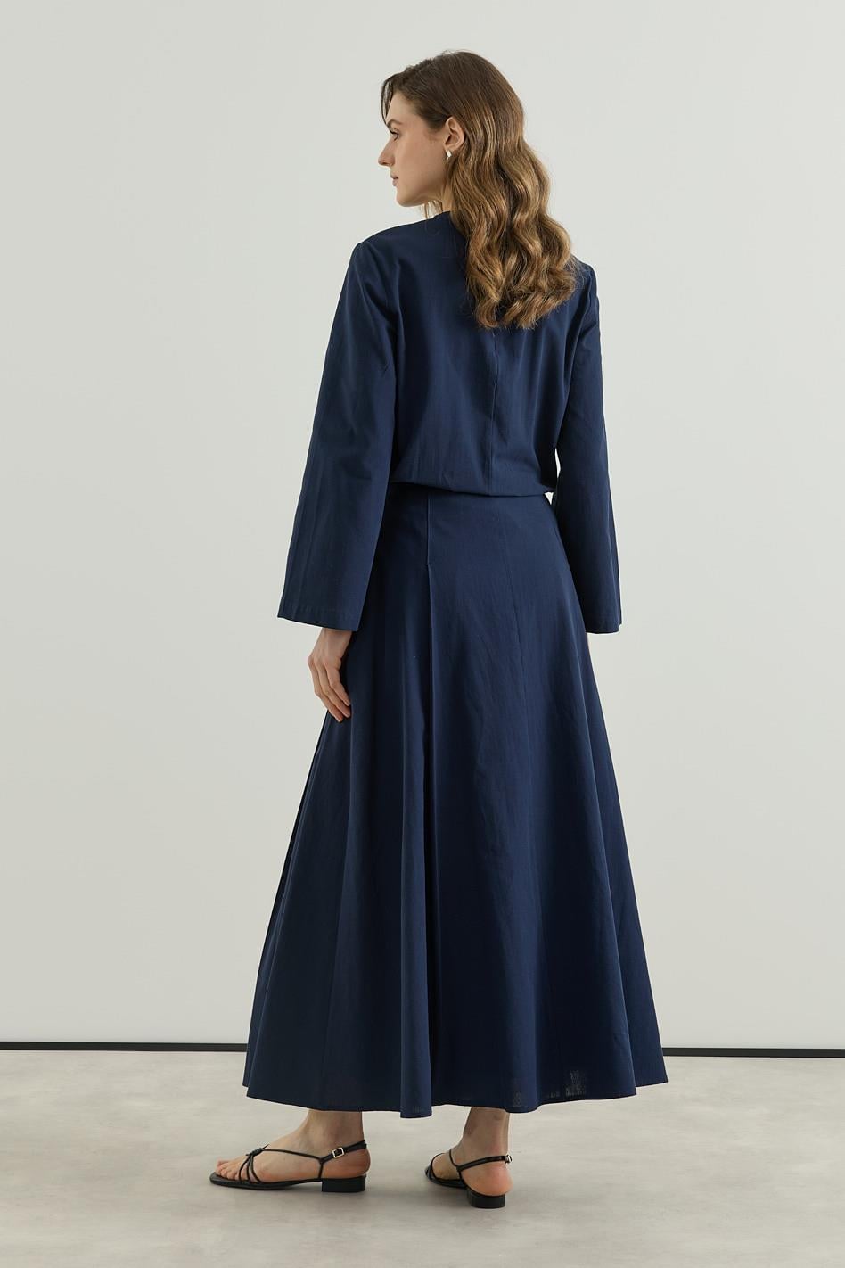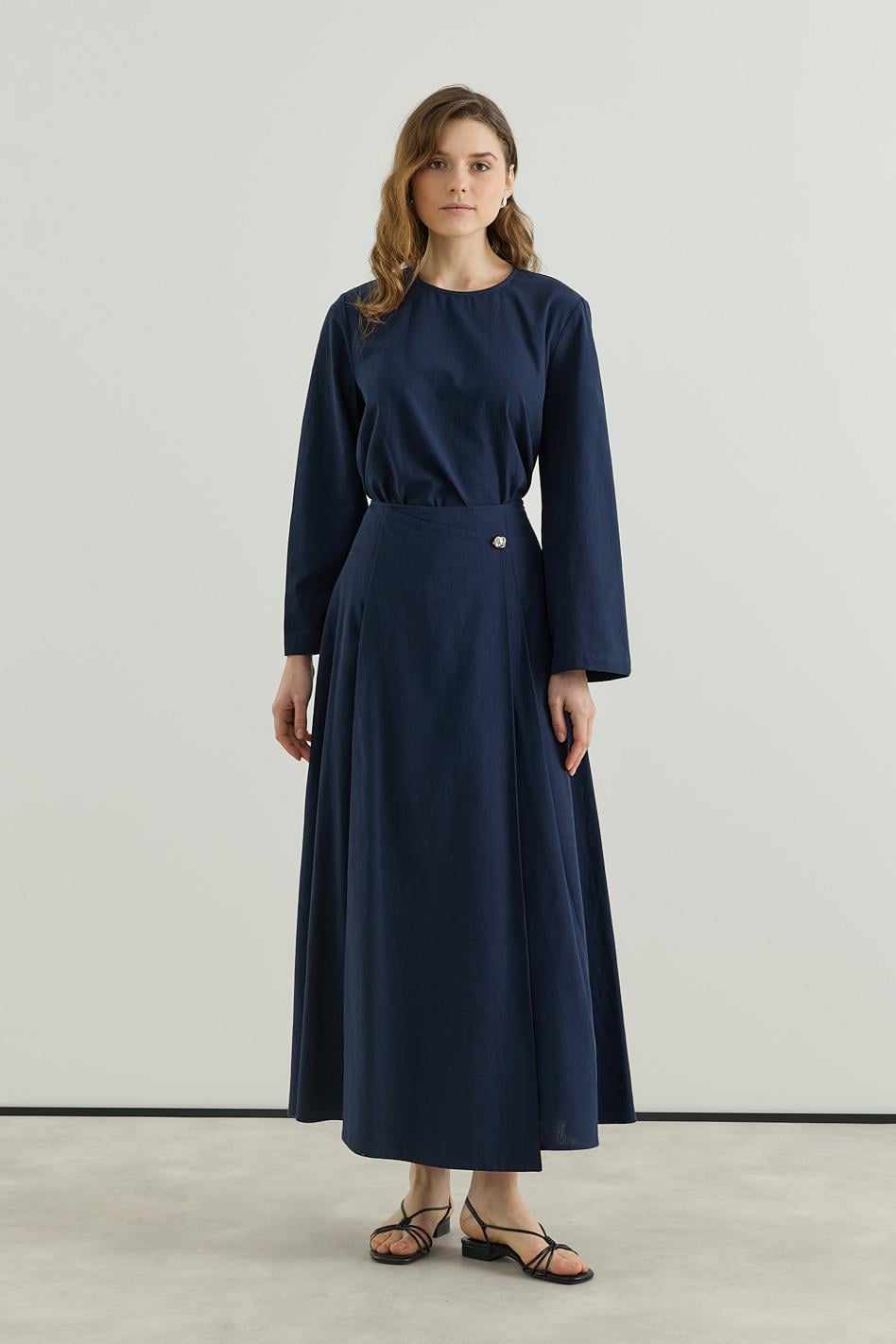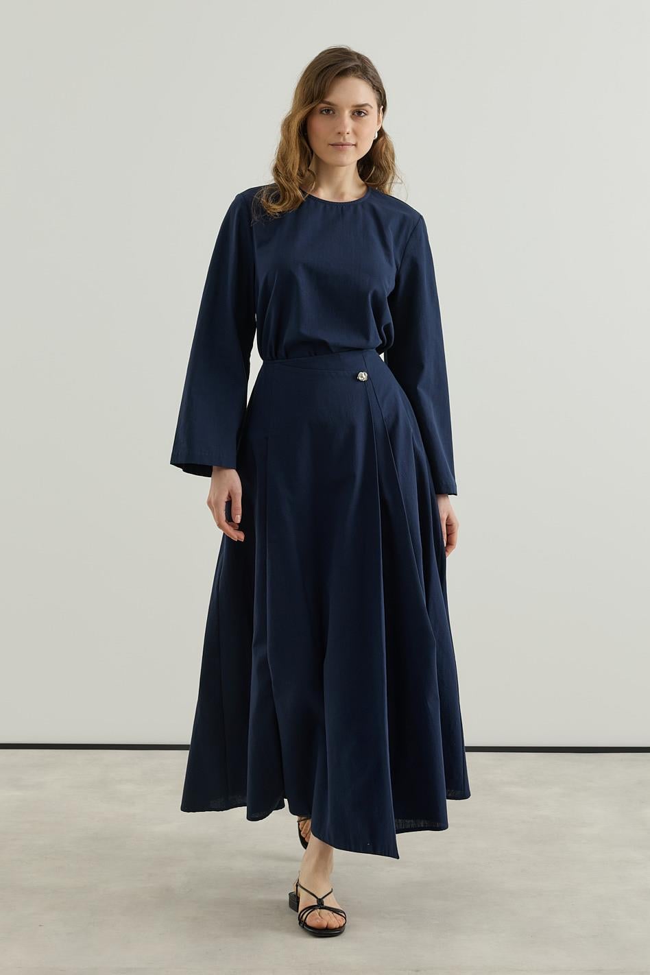 Asimetrik Kapamalı Pileli Etek bluz Keten Takım Lacivert