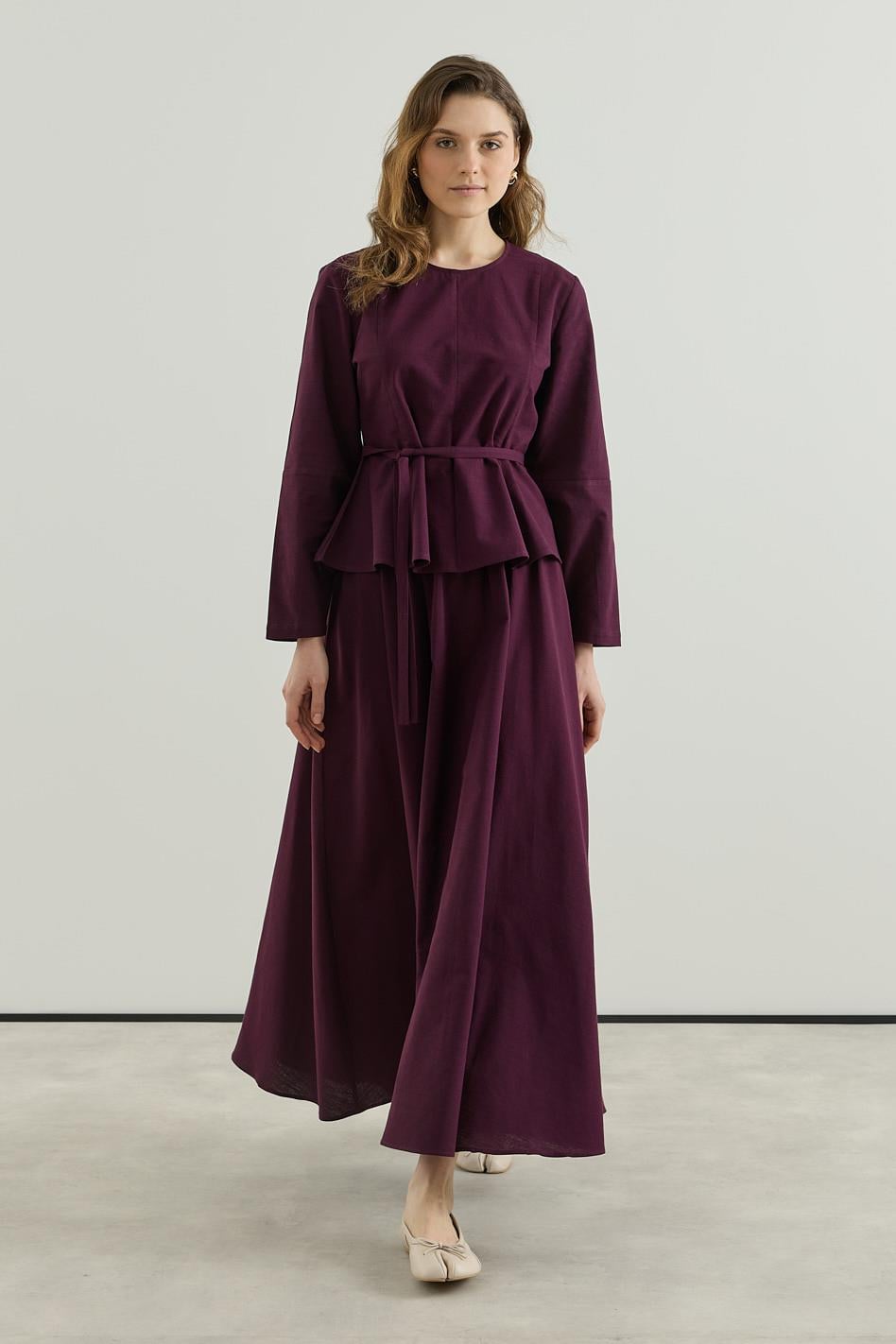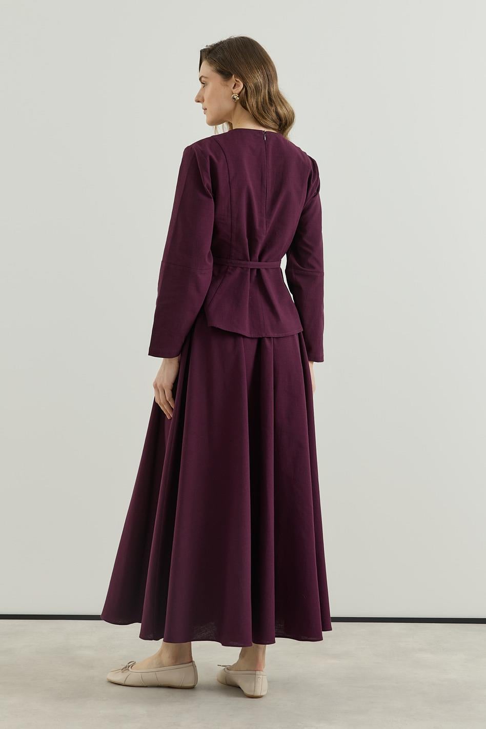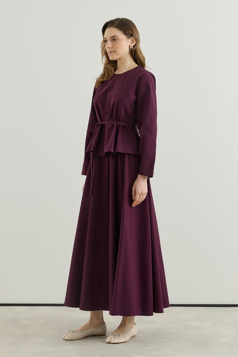 Bluzu Volanlı Etekli Keten Takım Bordo