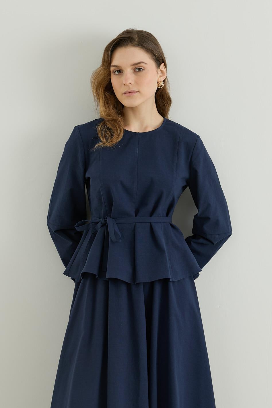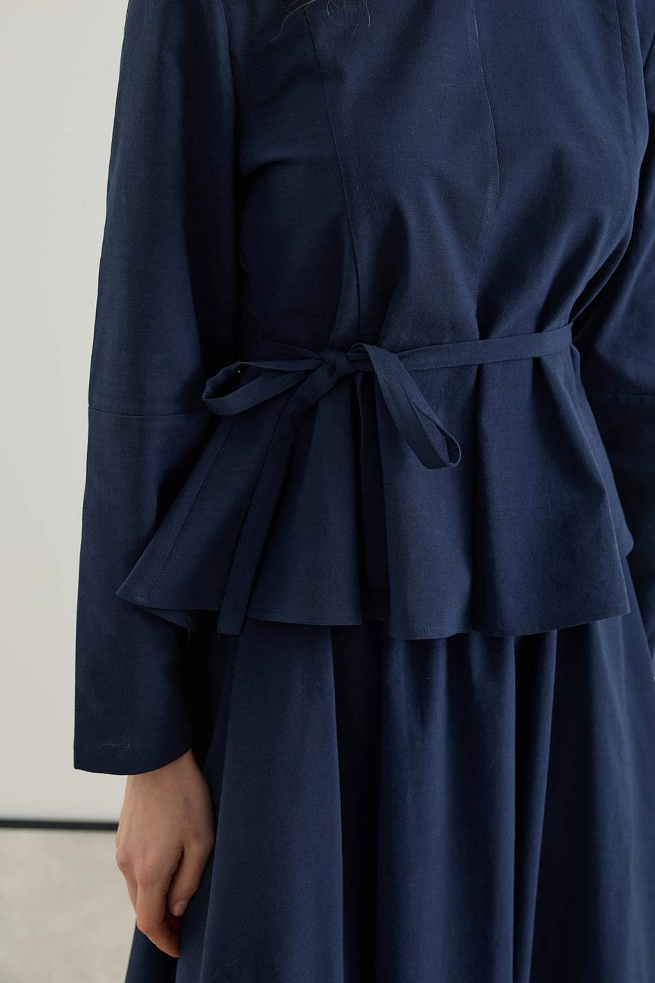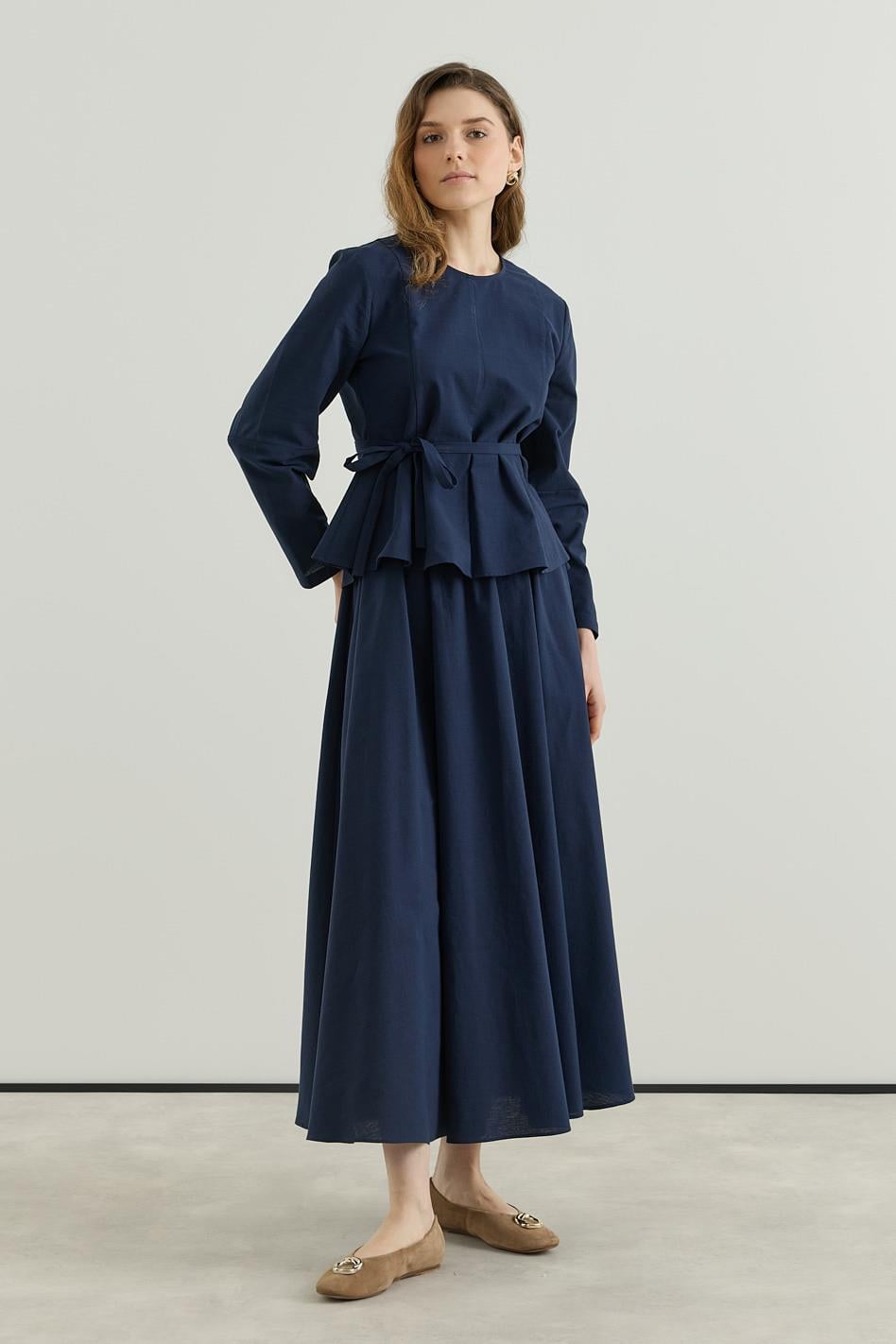 Bluzu Volanlı Etekli Keten Takım Lacivert