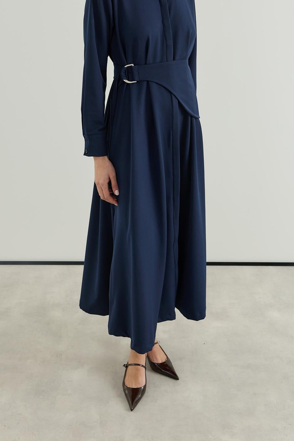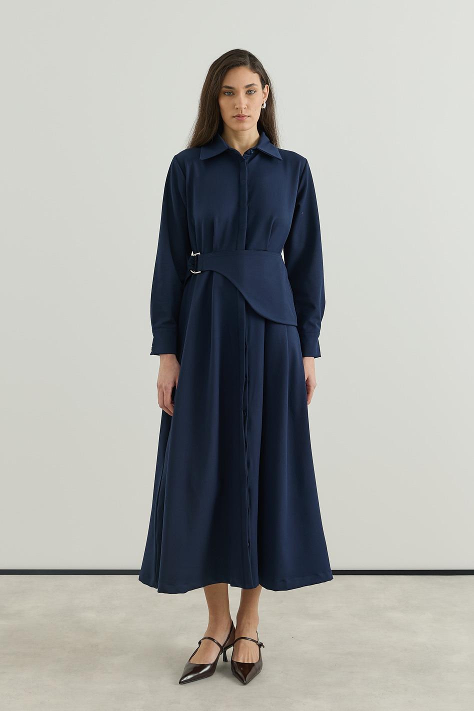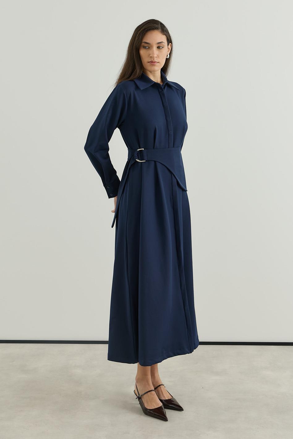 D tokalı Büyük Kemerli Keten Elbise Lacivert