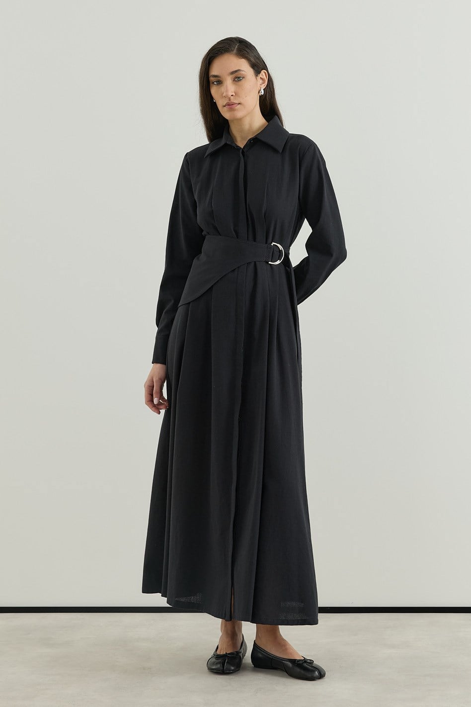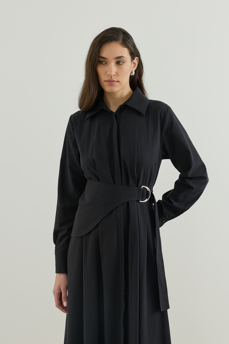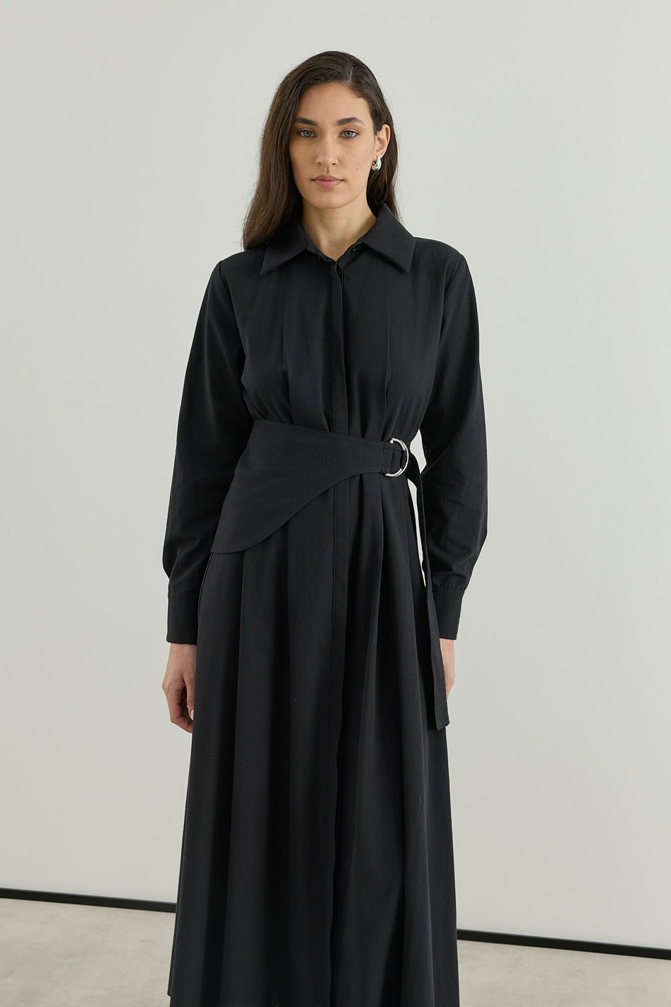 D tokalı Büyük Kemerli Keten Elbise Siyah