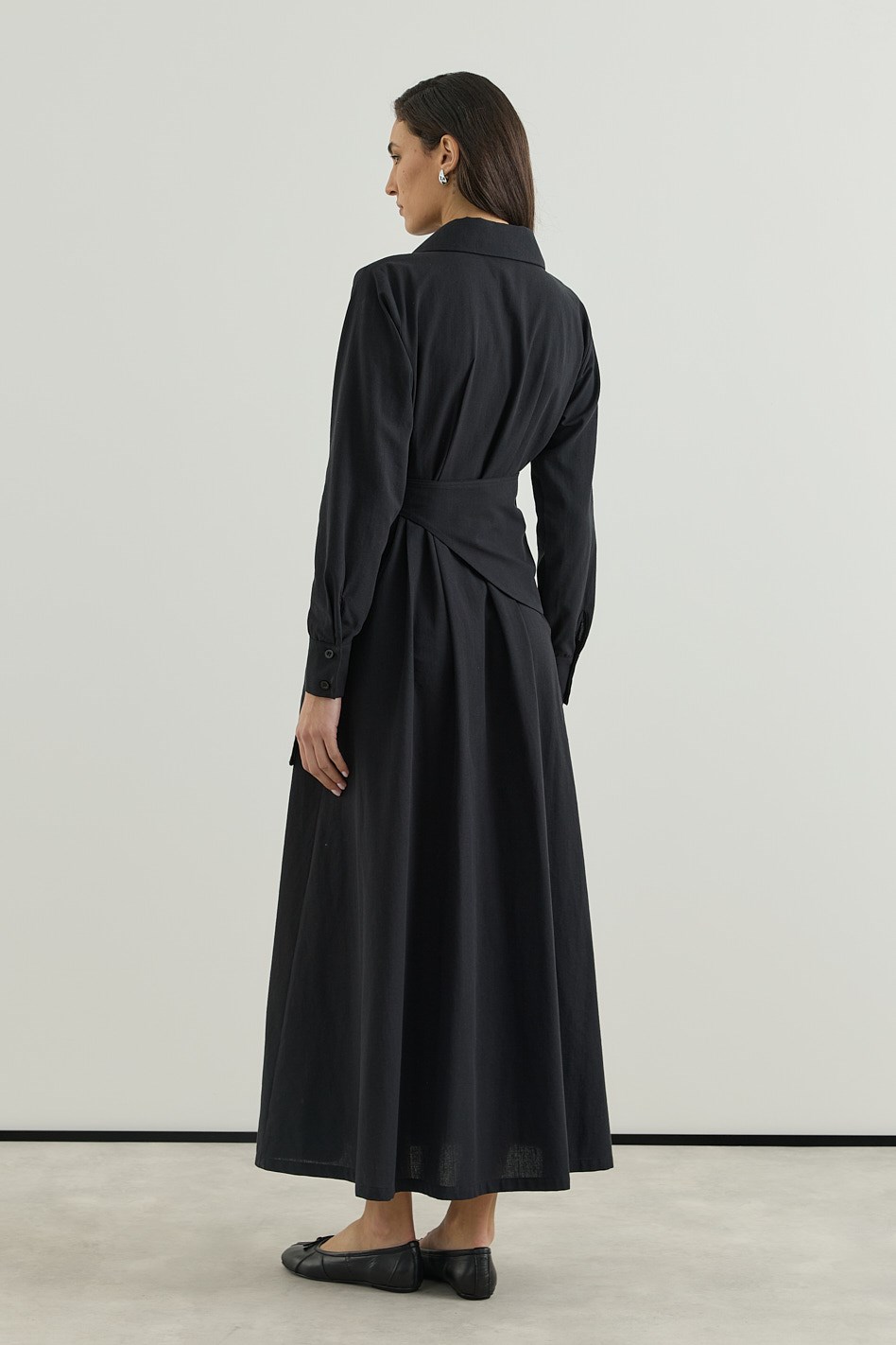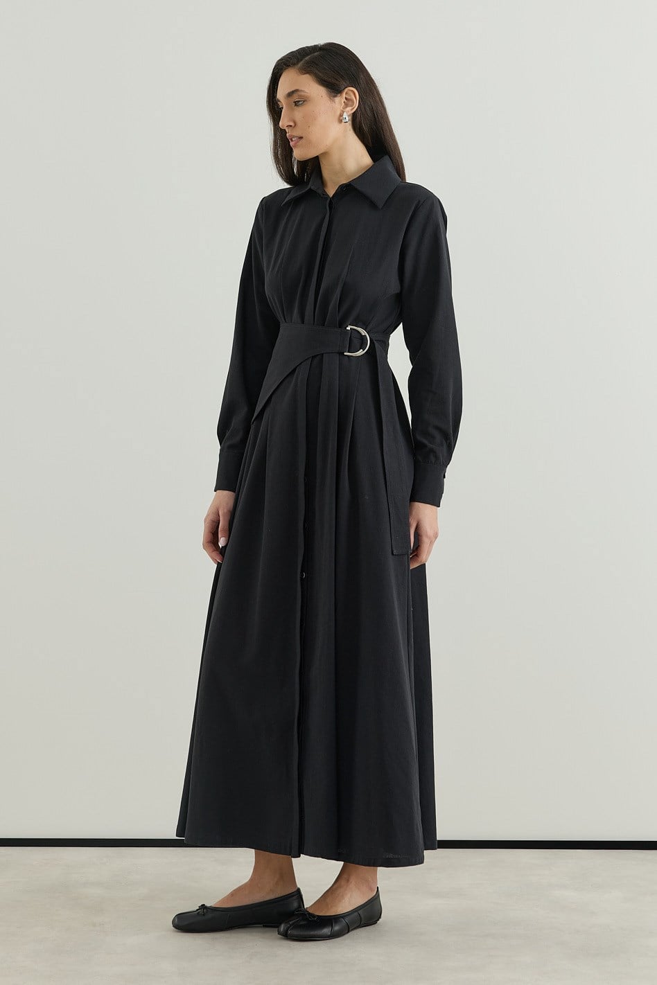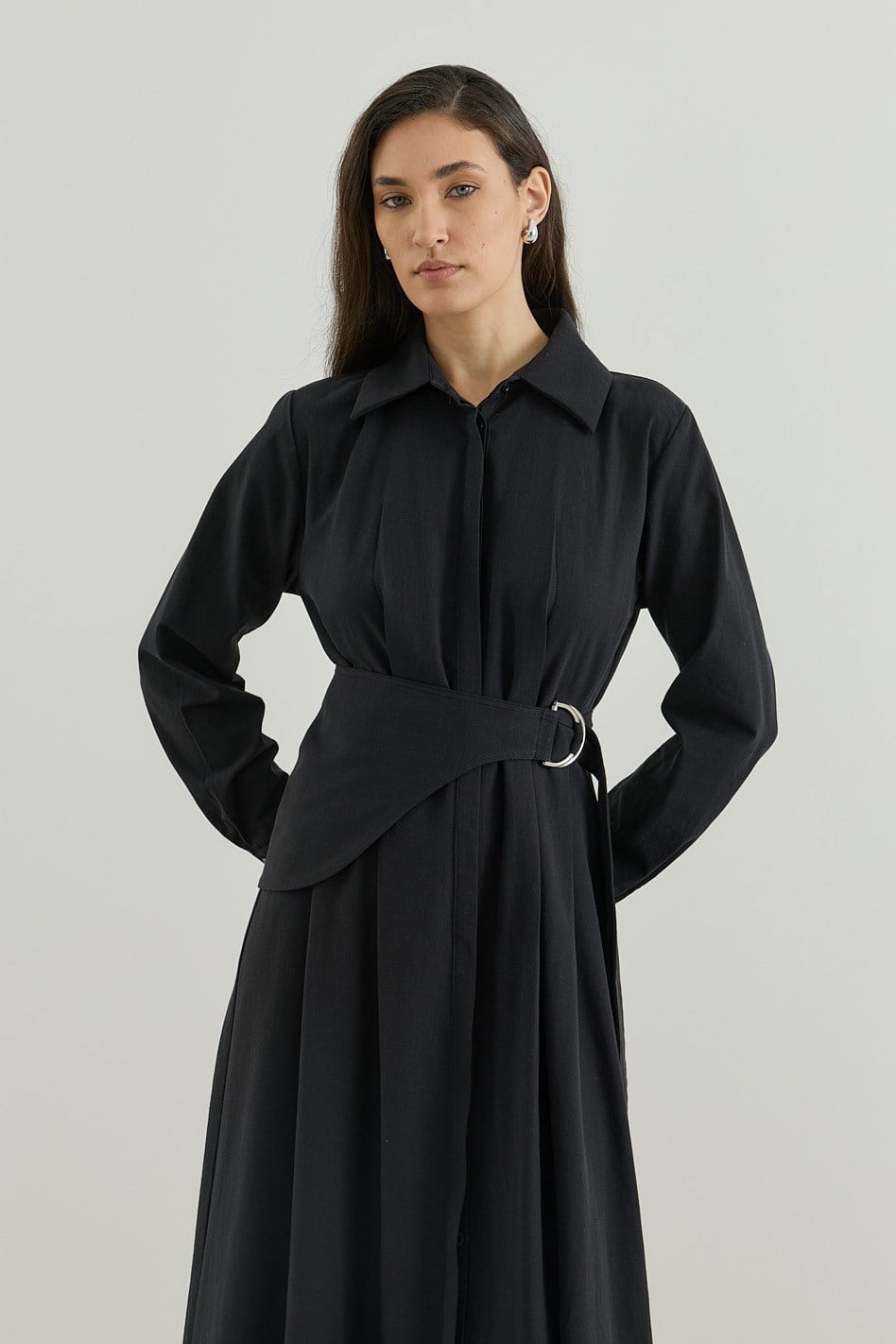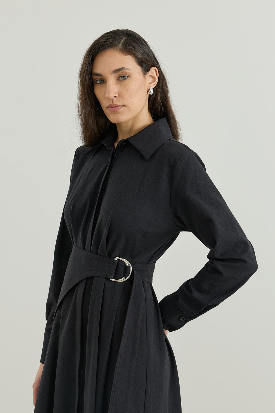 D tokalı Büyük Kemerli Keten Elbise Siyah