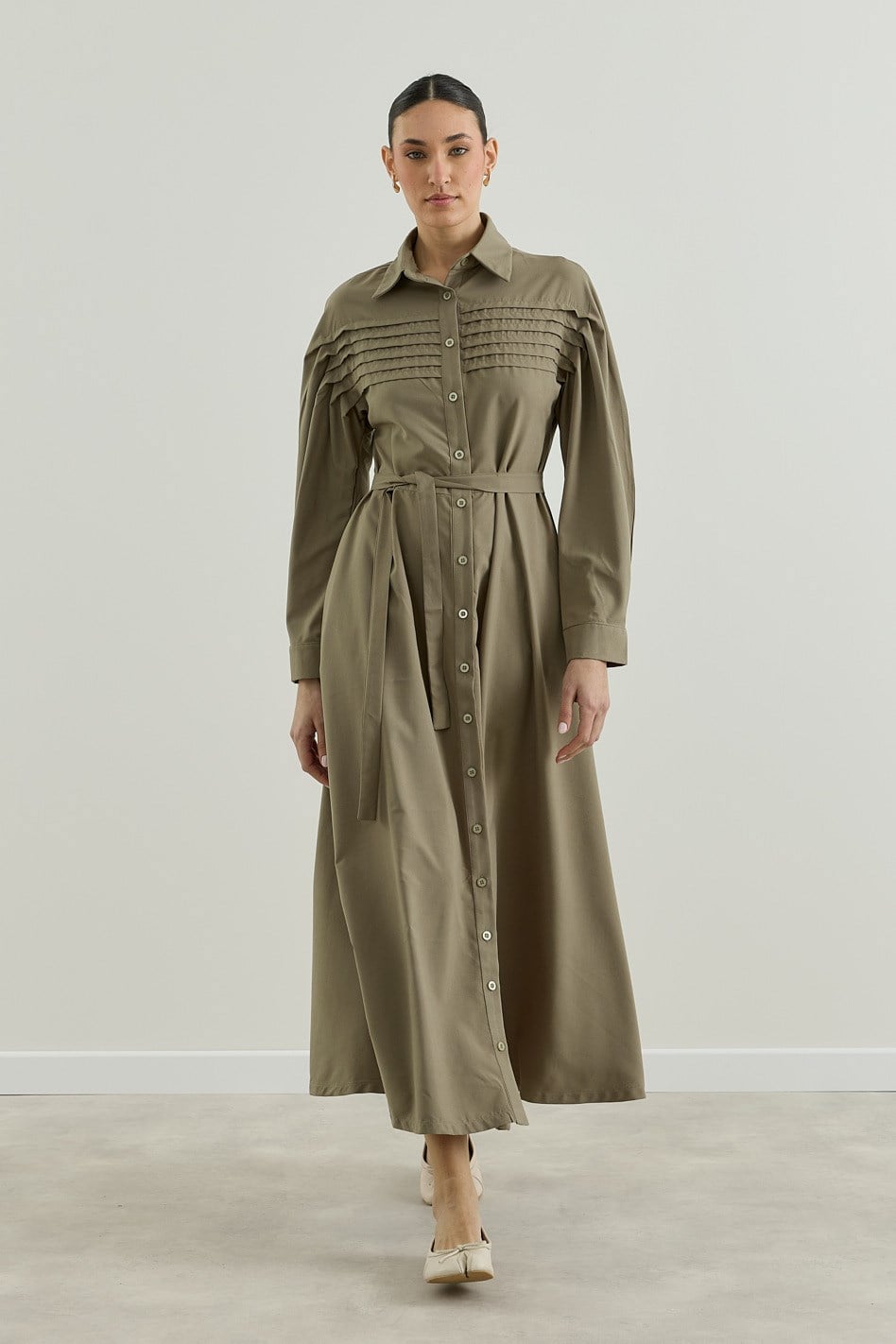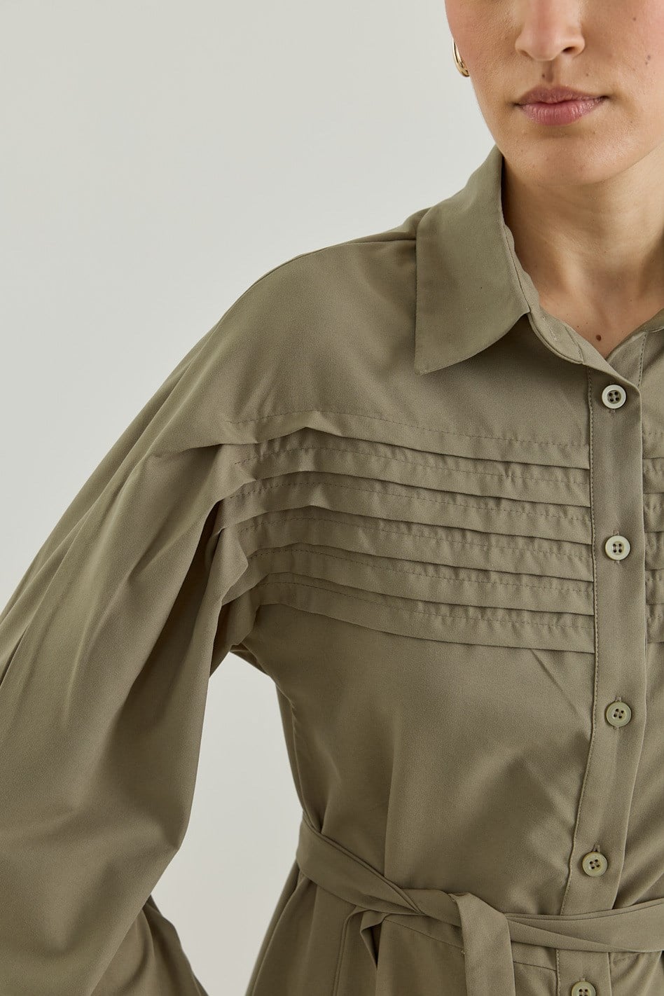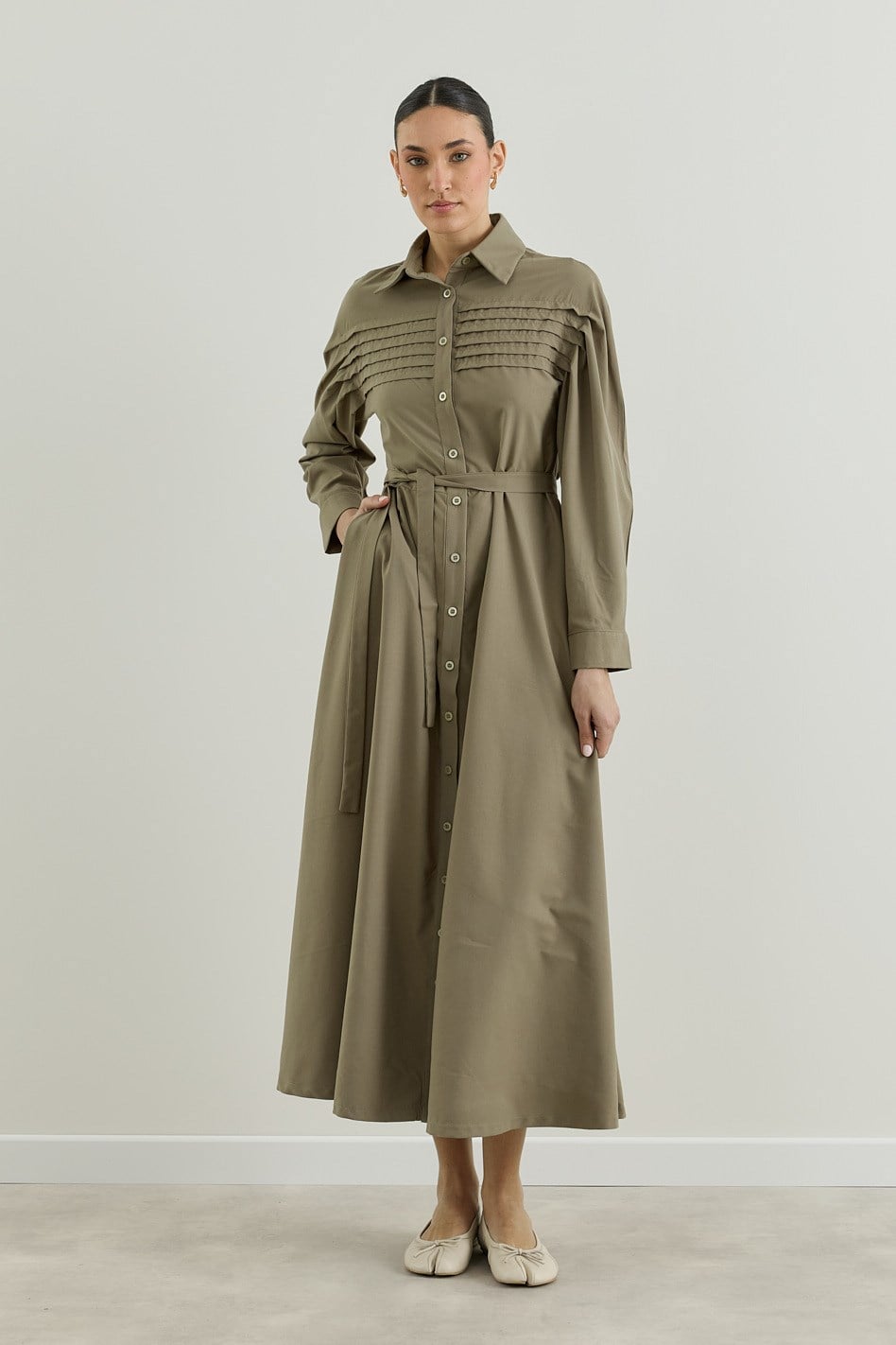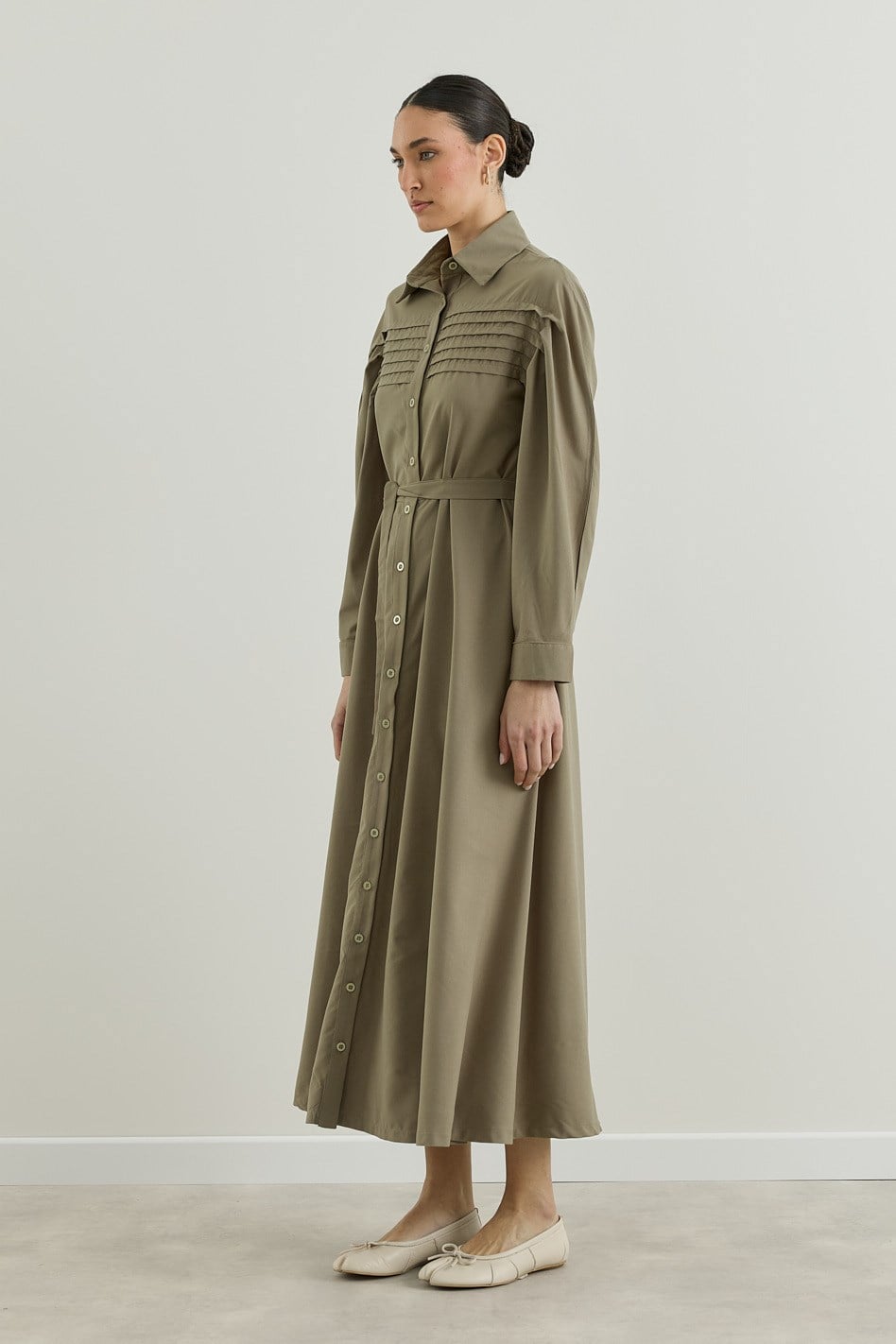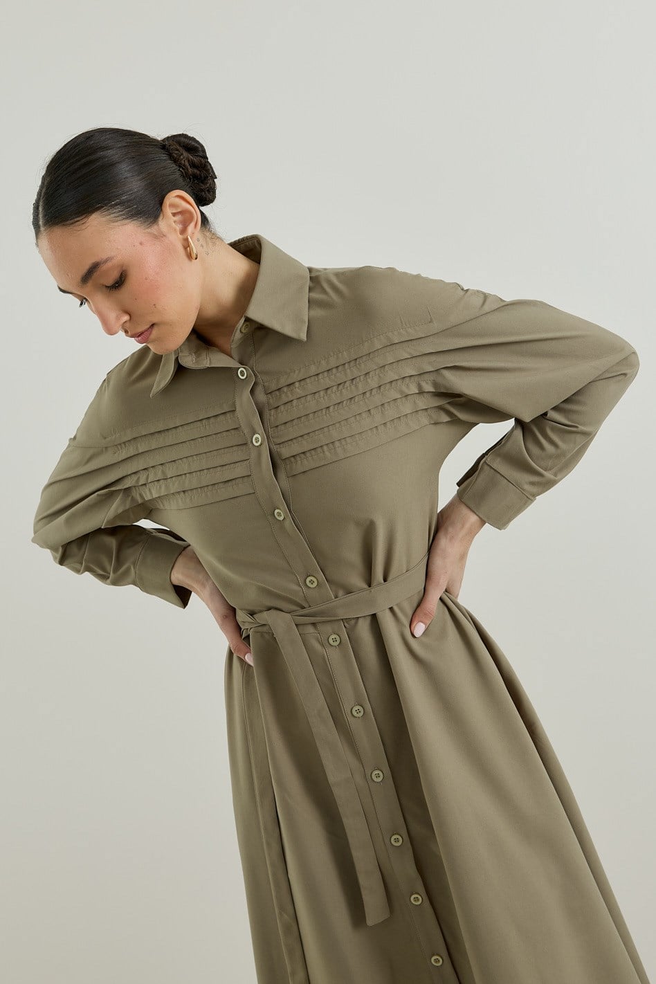 Nervür Detaylı Gömlek Elbise Haki