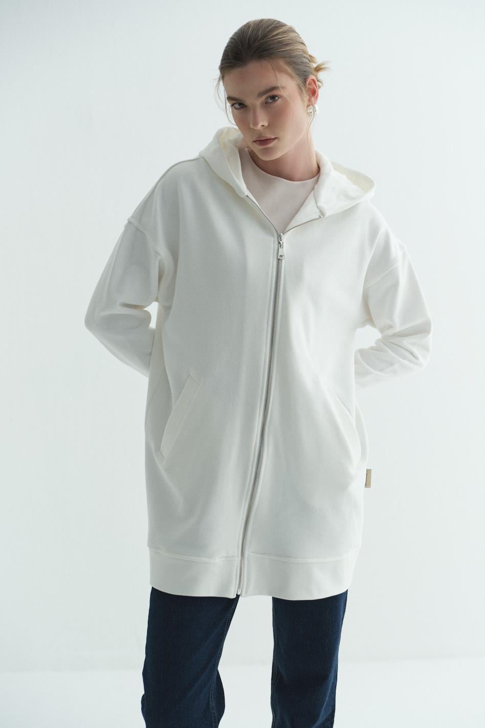 Üç İplik Kapüşonlu Fermuarlı Sweatshirt Ekru
