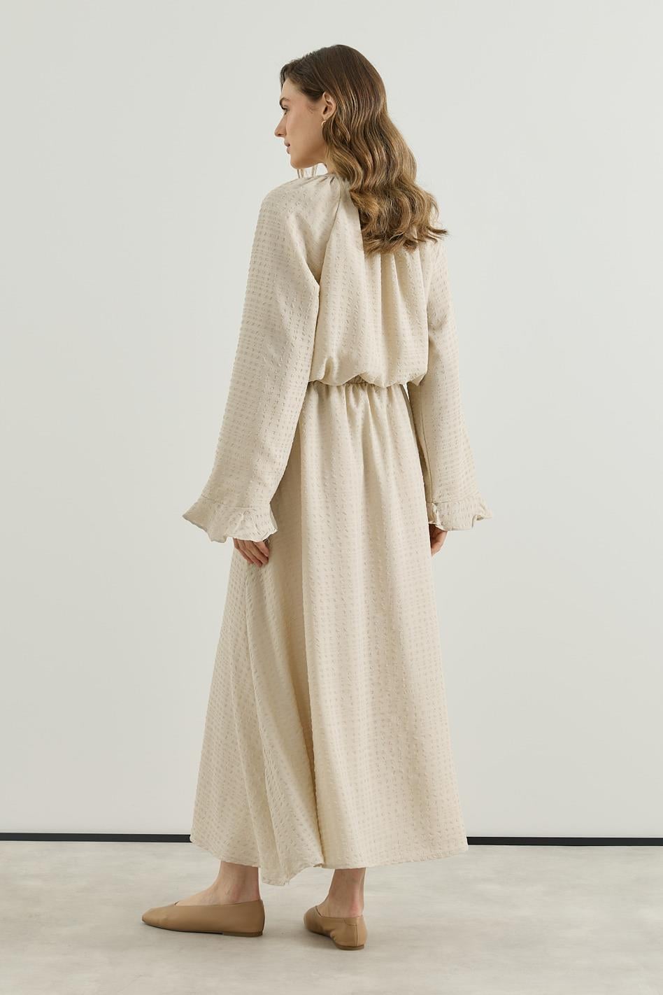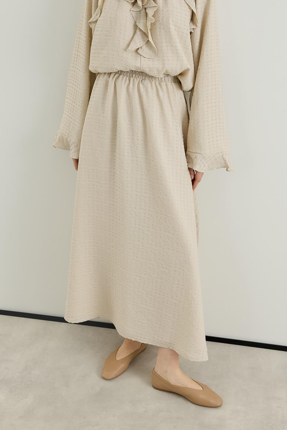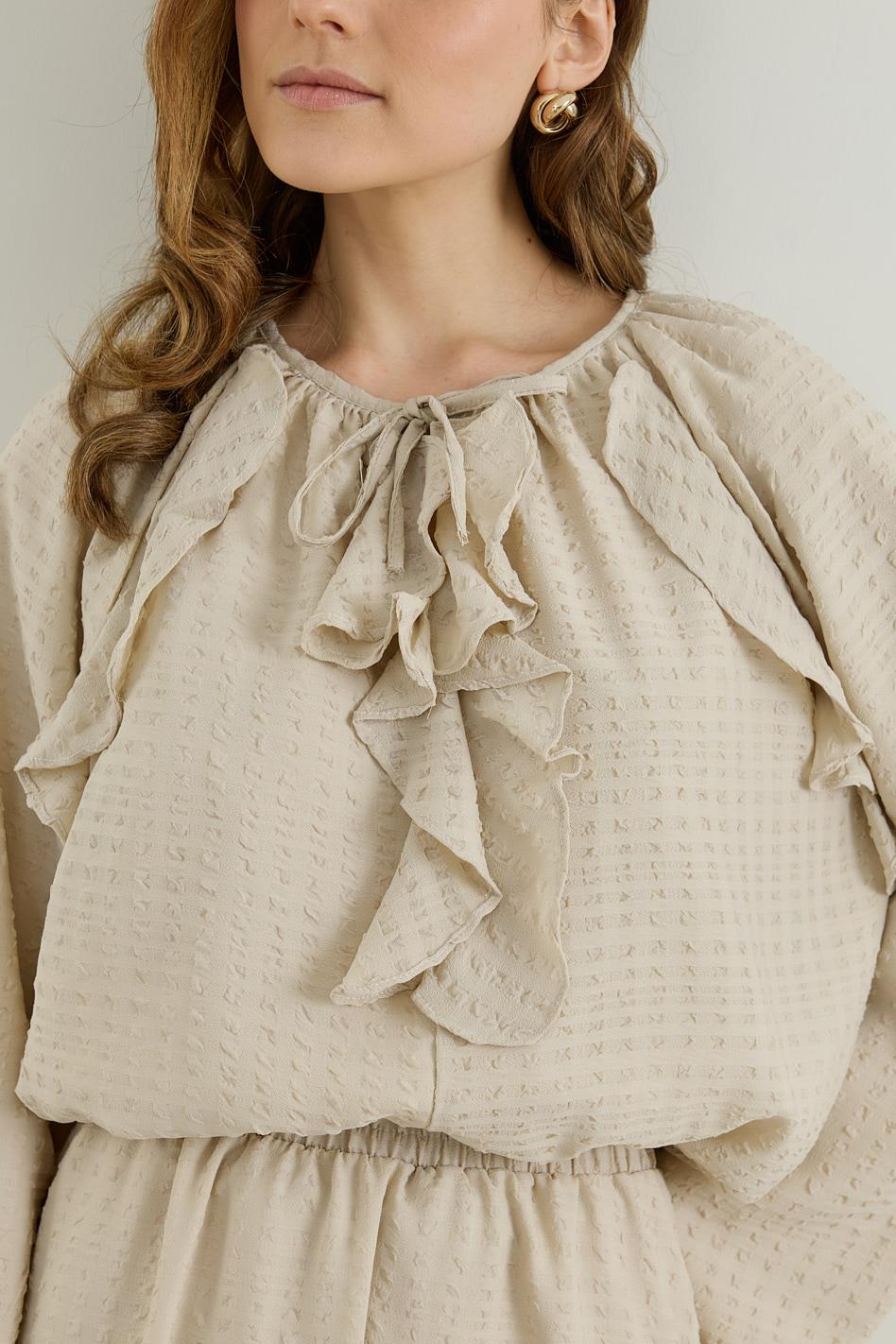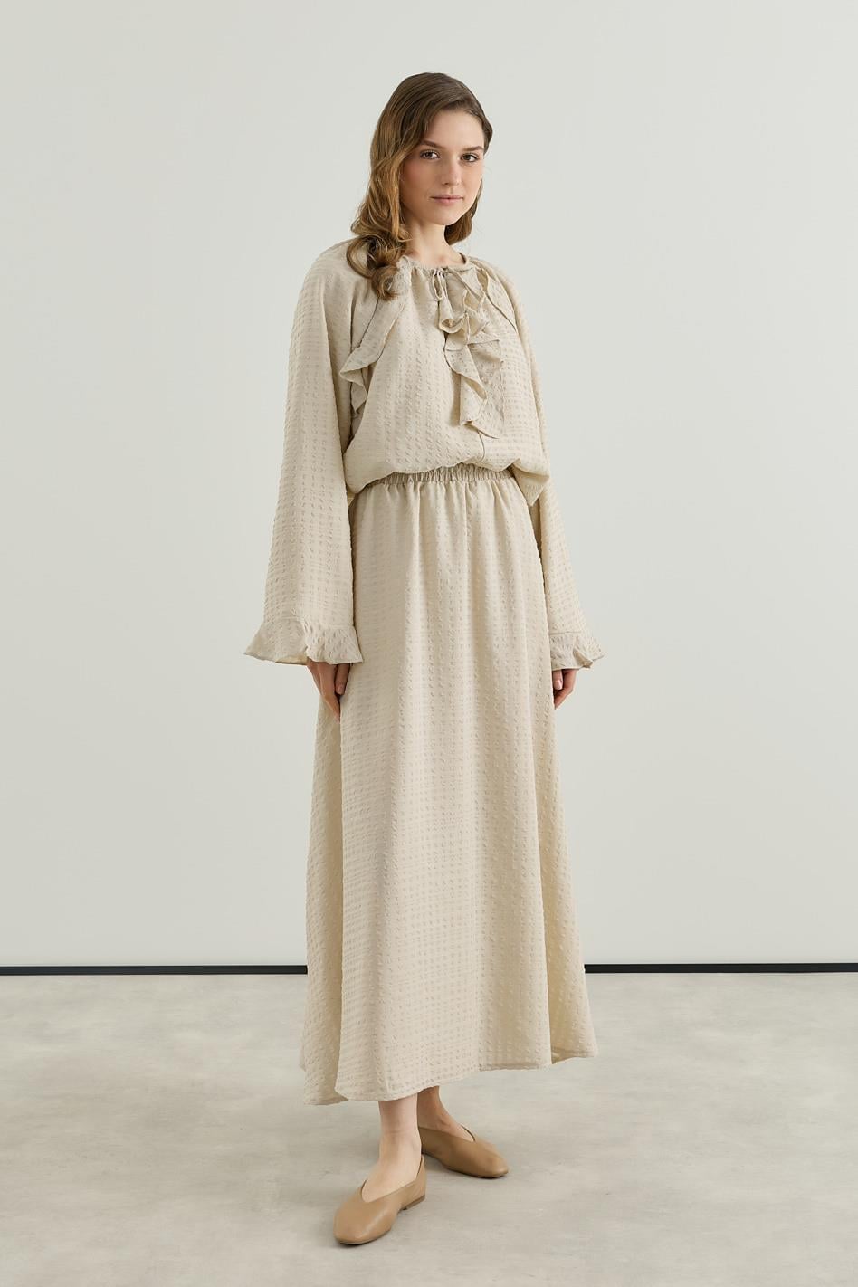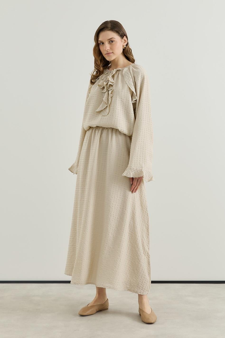 Volan Detaylı Bluz Etek Gofre Astarlı Takım Bej