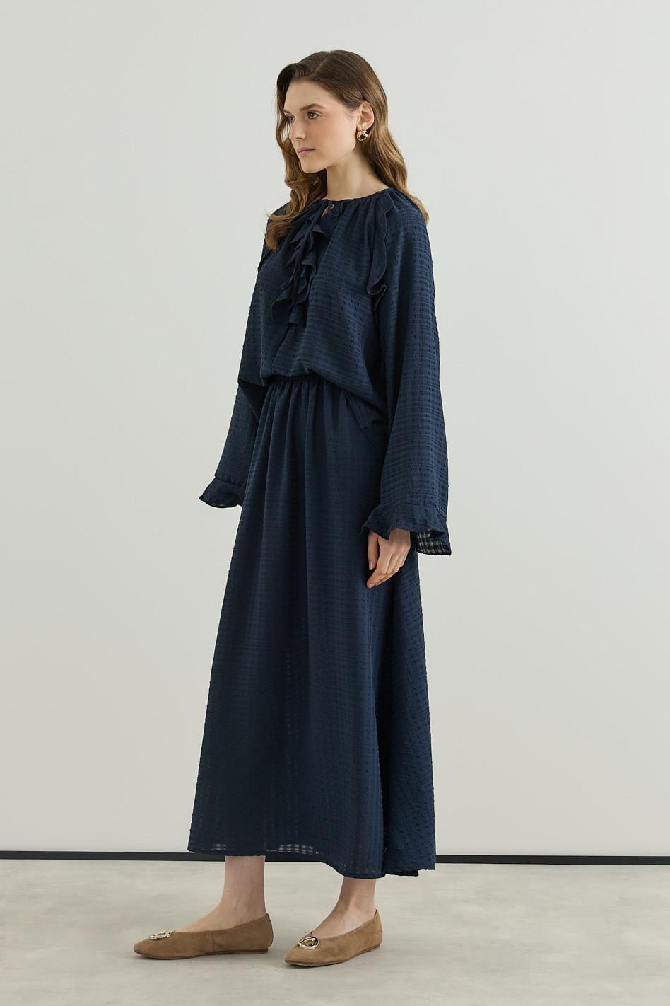 Volan Detaylı Bluz Etek Gofre Astarlı Takım Laciivert