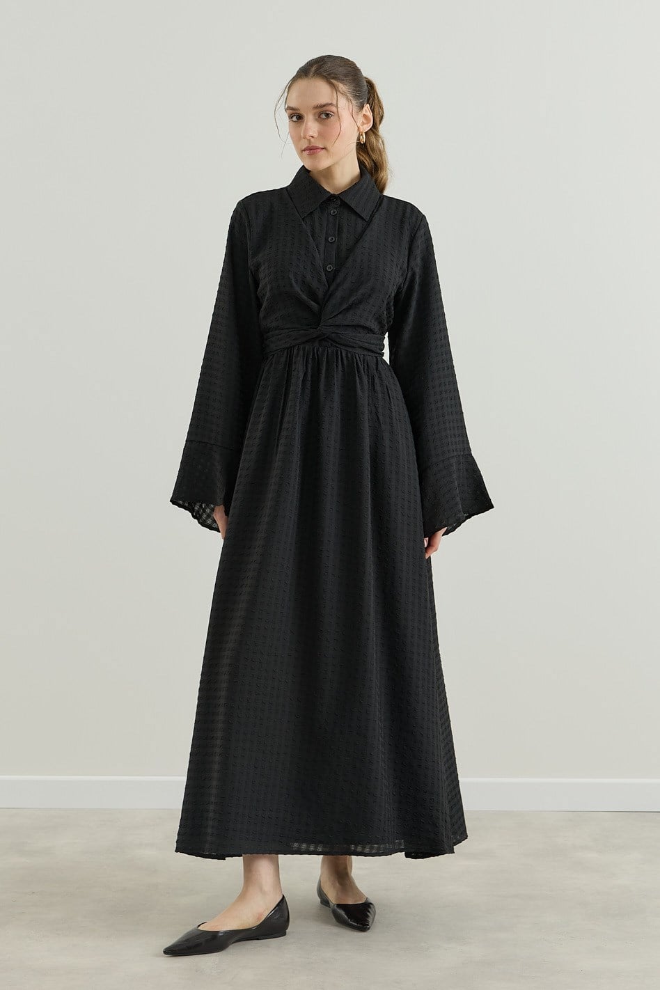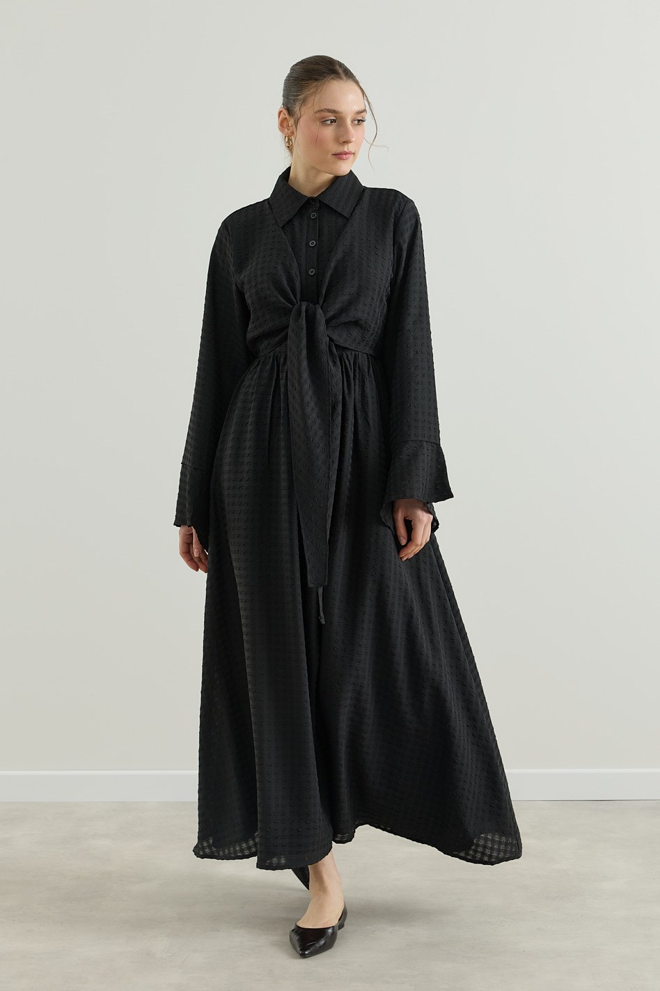 Gofre Astarlı Bağlama Detaylı Elbise Siyah