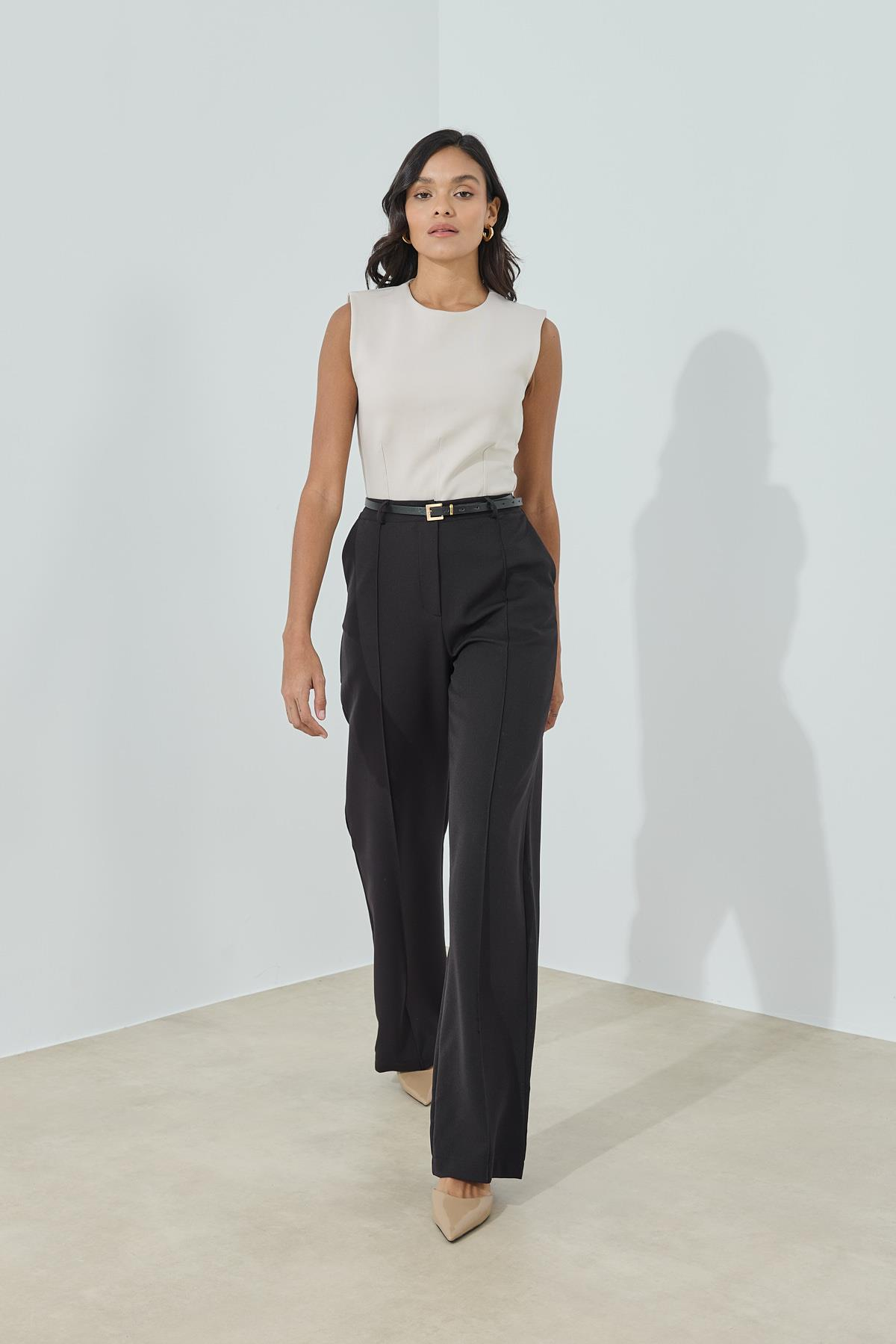 Kemerli Nervürlü Palazzo Pantolon Siyah
