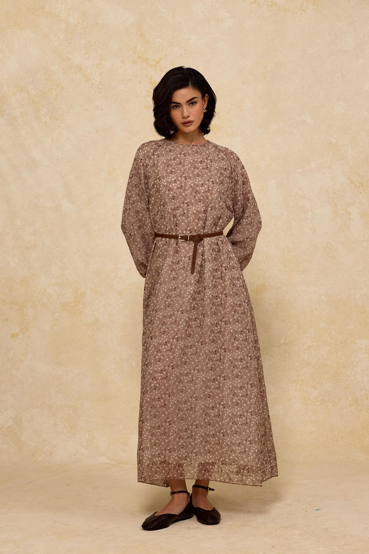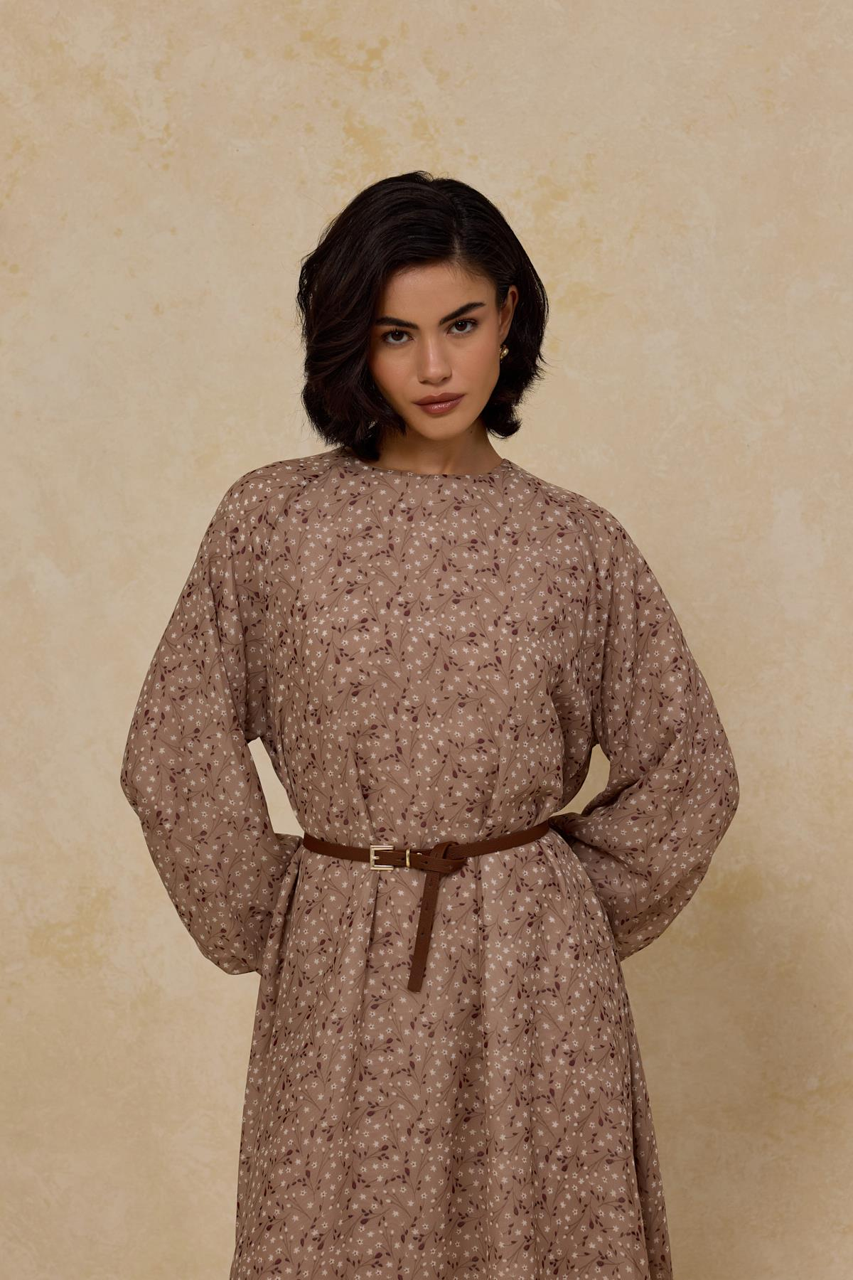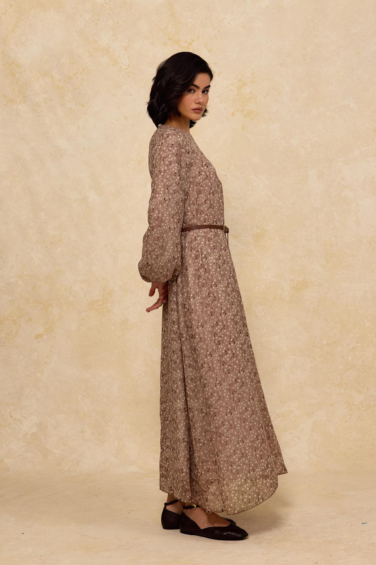 Kemerli Şifon Elbise Bej
